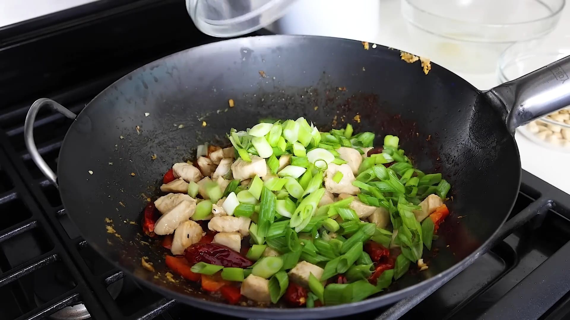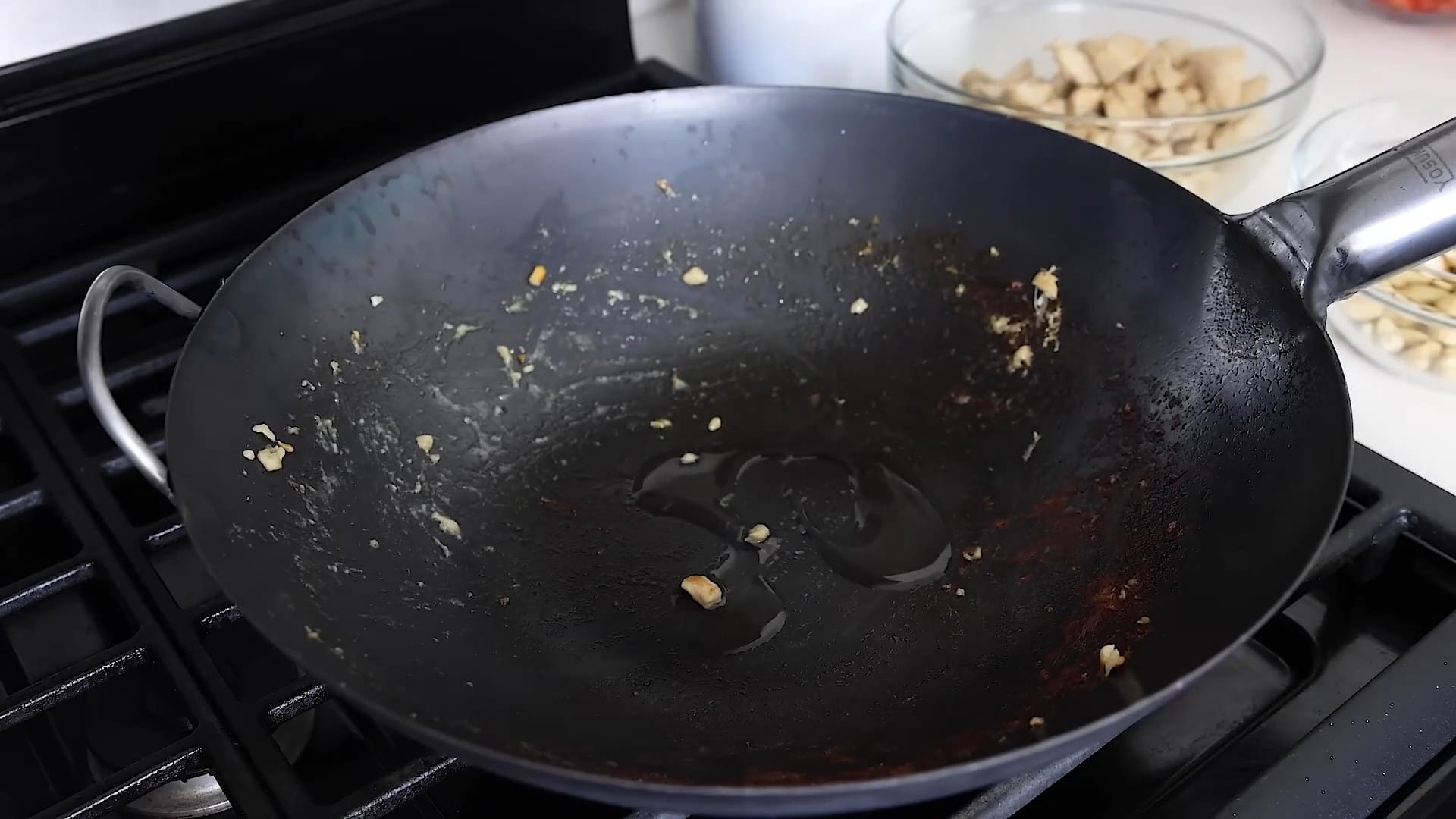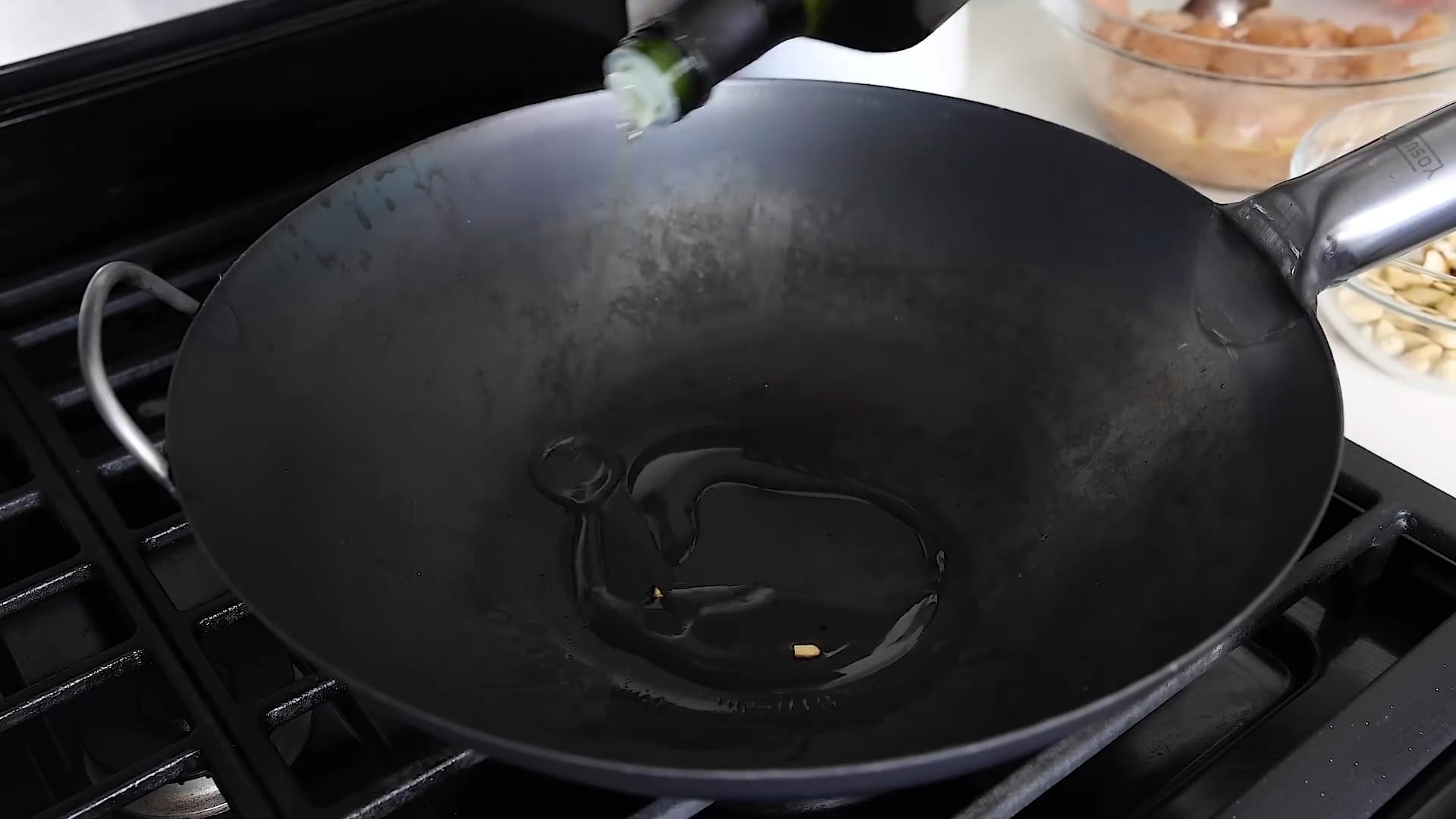 Add the raw peanuts or cashews to the hot wok and dry roast for 1 minute, stirring constantly.