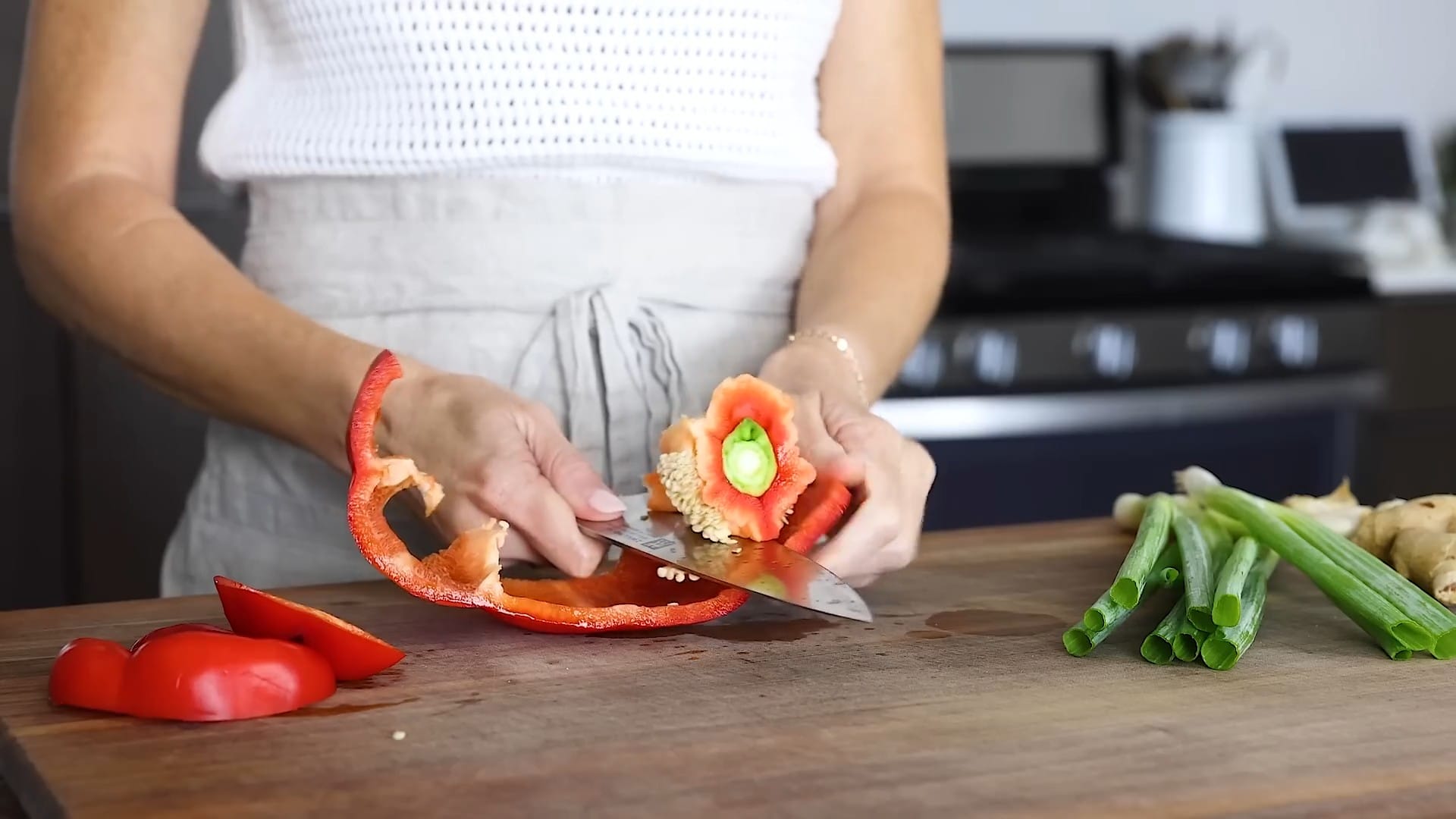 Slice the top and bottom off the red bell pepper, remove the seeds, and chop.