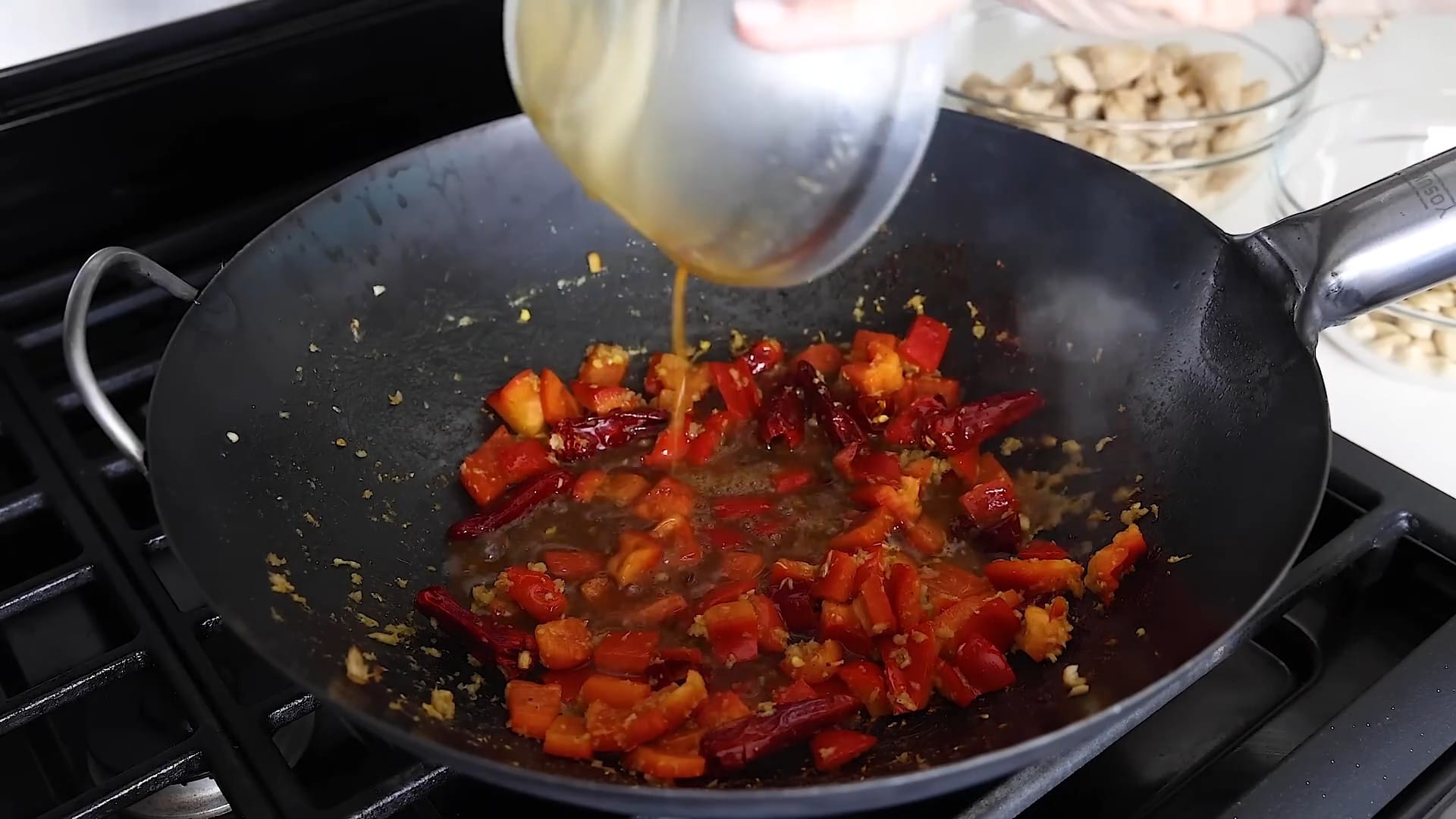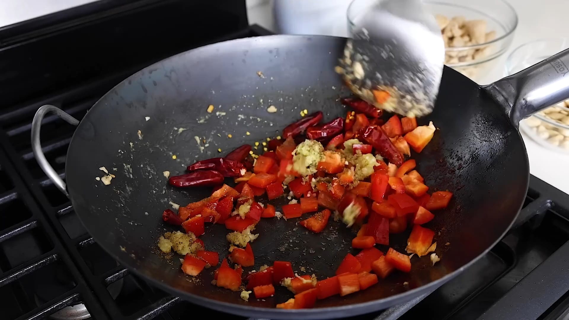 Add the chopped bell pepper, whole and sliced dried chili peppers, minced garlic, grated ginger, and 1 tsp Sichuan peppercorn powder to the wok.