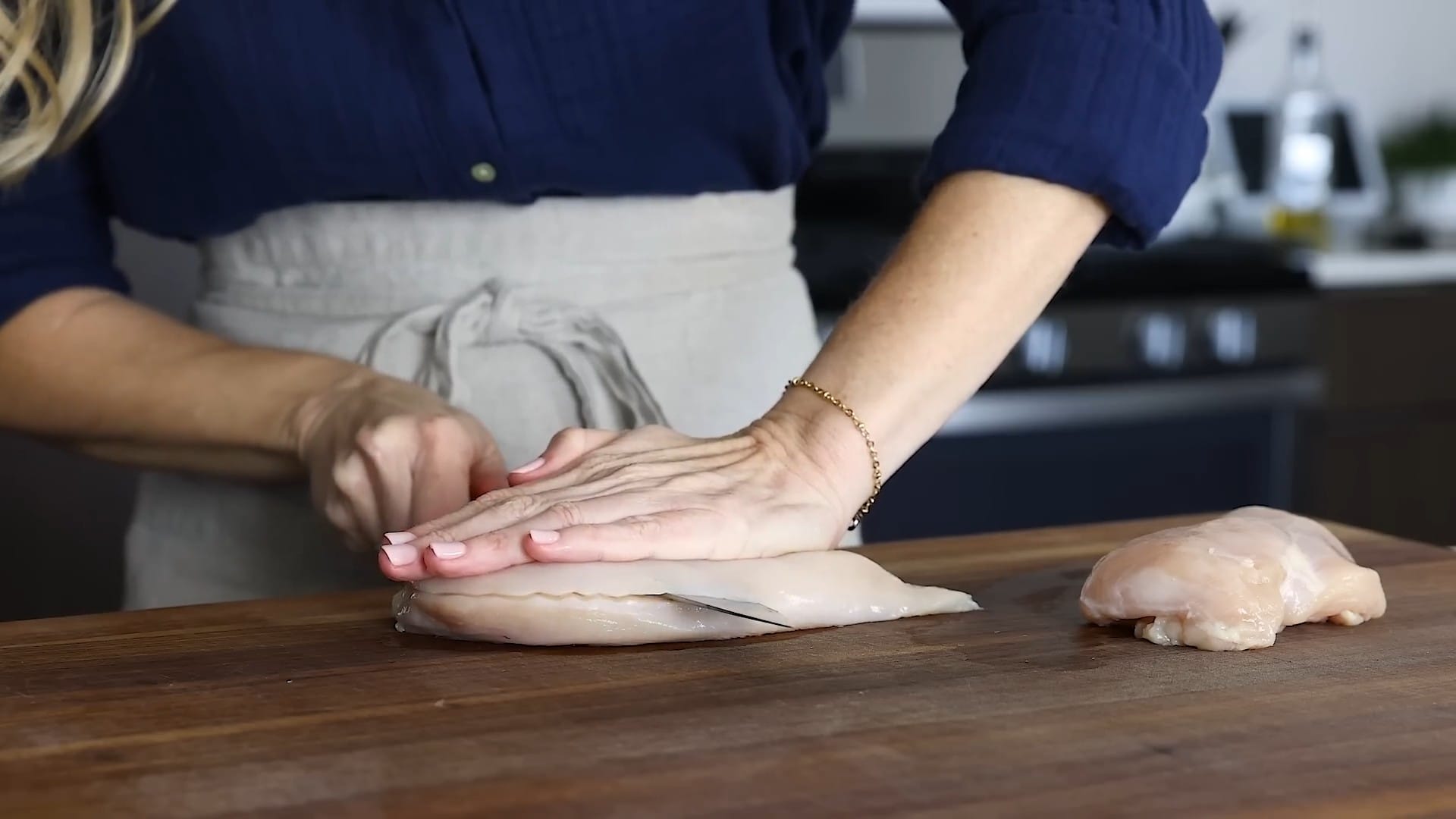 Slice the chicken breasts in half lengthwise.
