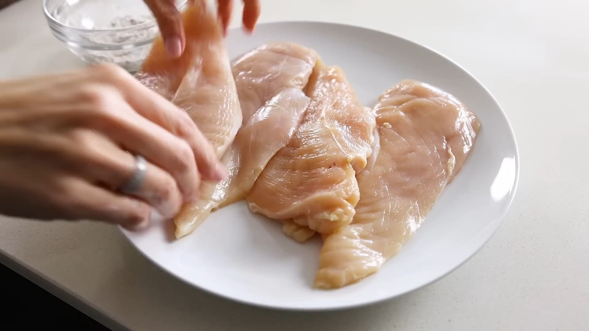Lay the chicken breasts on a plate.