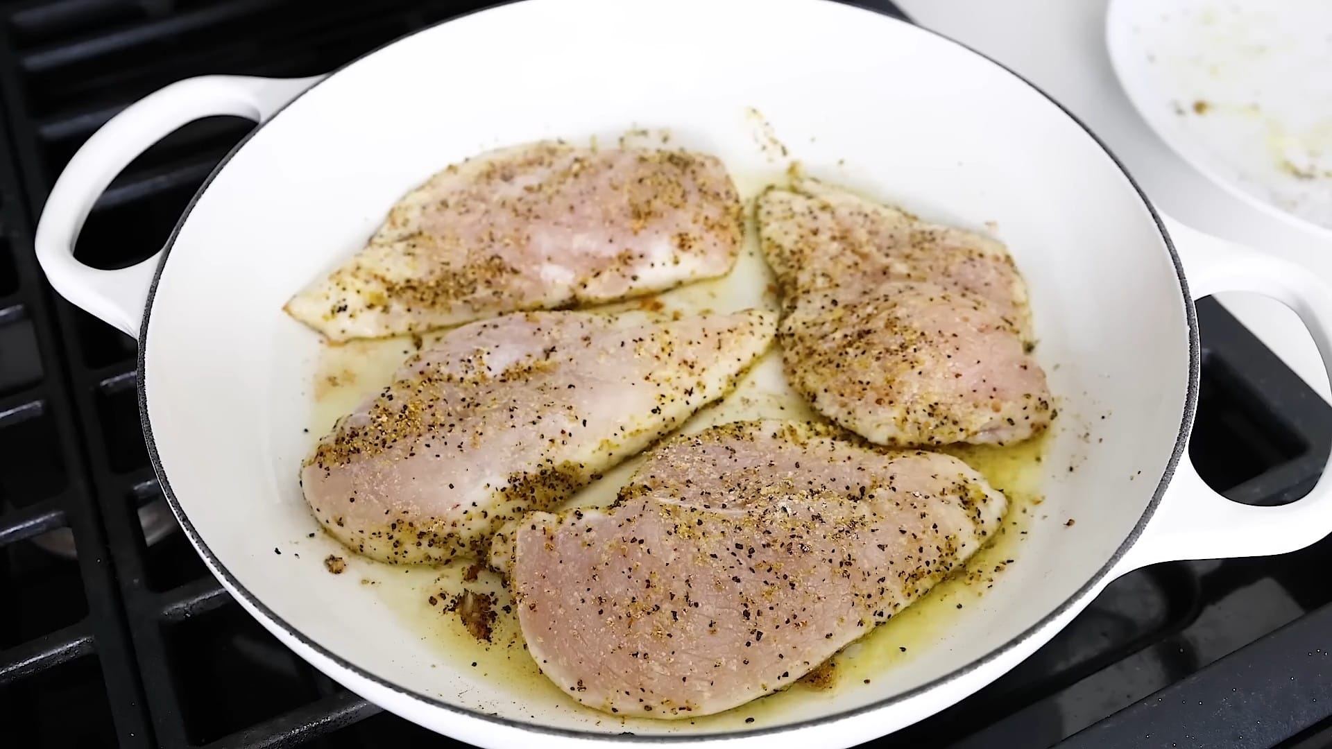 Add the seasoned chicken breasts to the pan.