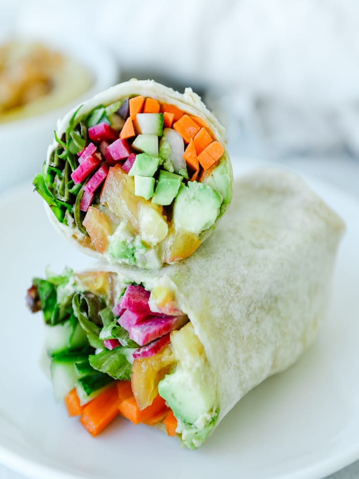 Enjoy your loaded veggie hummus wrap right away! If you’re saving it for later, wrap it in foil or plastic wrap to keep it fresh.