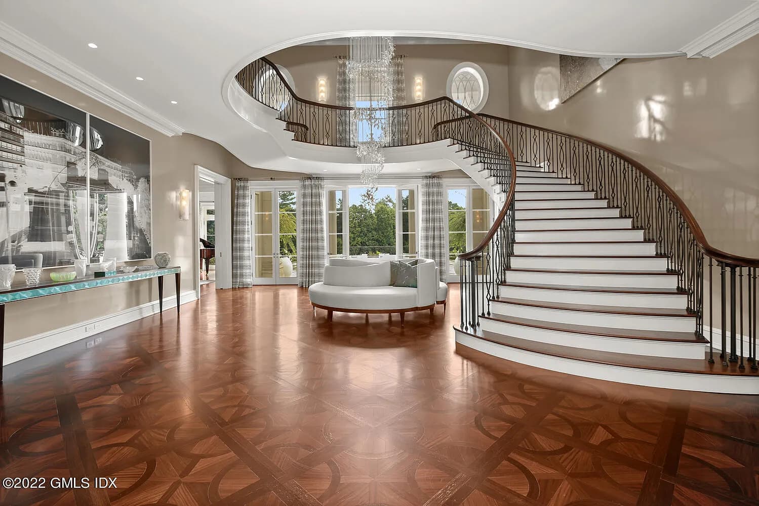 This exceptional estate, located at 555 Lake Ave, Greenwich, CT, is a true masterpiece of design and craftsmanship. The 8-bedroom, 13-bathroom single family residence, built in 2001 and remodeled in 2015, spans an impressive 18,954 sq. ft. and is situated on a sprawling 8.23-acre lot. The architectural style is Georgian Colonial, constructed with durable brick and featuring a slate roof. Inside, one finds a grand reception hall with a stunning 3-story chandelier and Wenge walnut parquetry floor, leading to a formal dining room with a fireplace and an elegant living room with a fireplace and custom bar. A distinguished two-story English mahogany library with a brass upper gallery provides a unique space for study and relaxation.