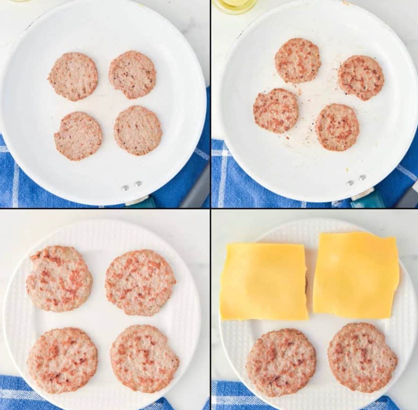 - Cook the sausage patties on the second side for two minutes. Then, top each patty with a slice of American cheese and cover for about a minute more or until the cheese melts.