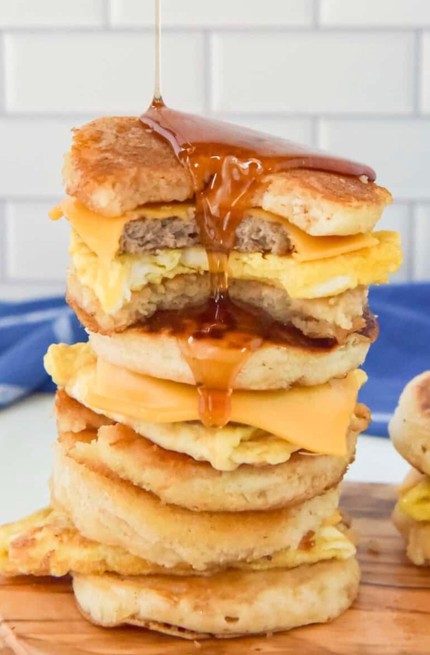 You can also prep the parts separately. Store cooked pancakes, eggs, and sausage in separate containers. Assemble your sandwich fresh each morning for the best taste.