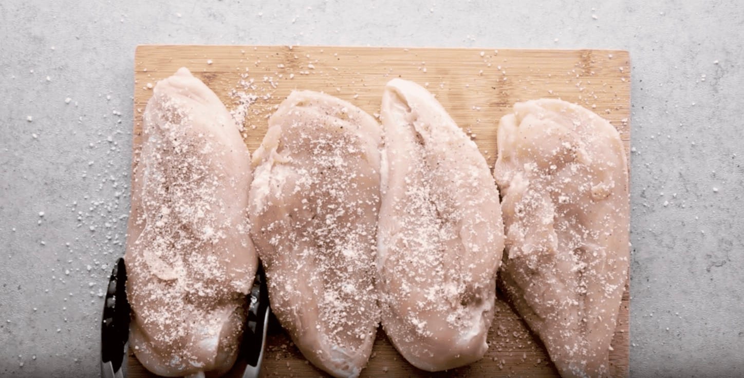 Make sure your chicken breasts are even. If not, put them in a plastic bag and pound them to ¾-1 inch thick.