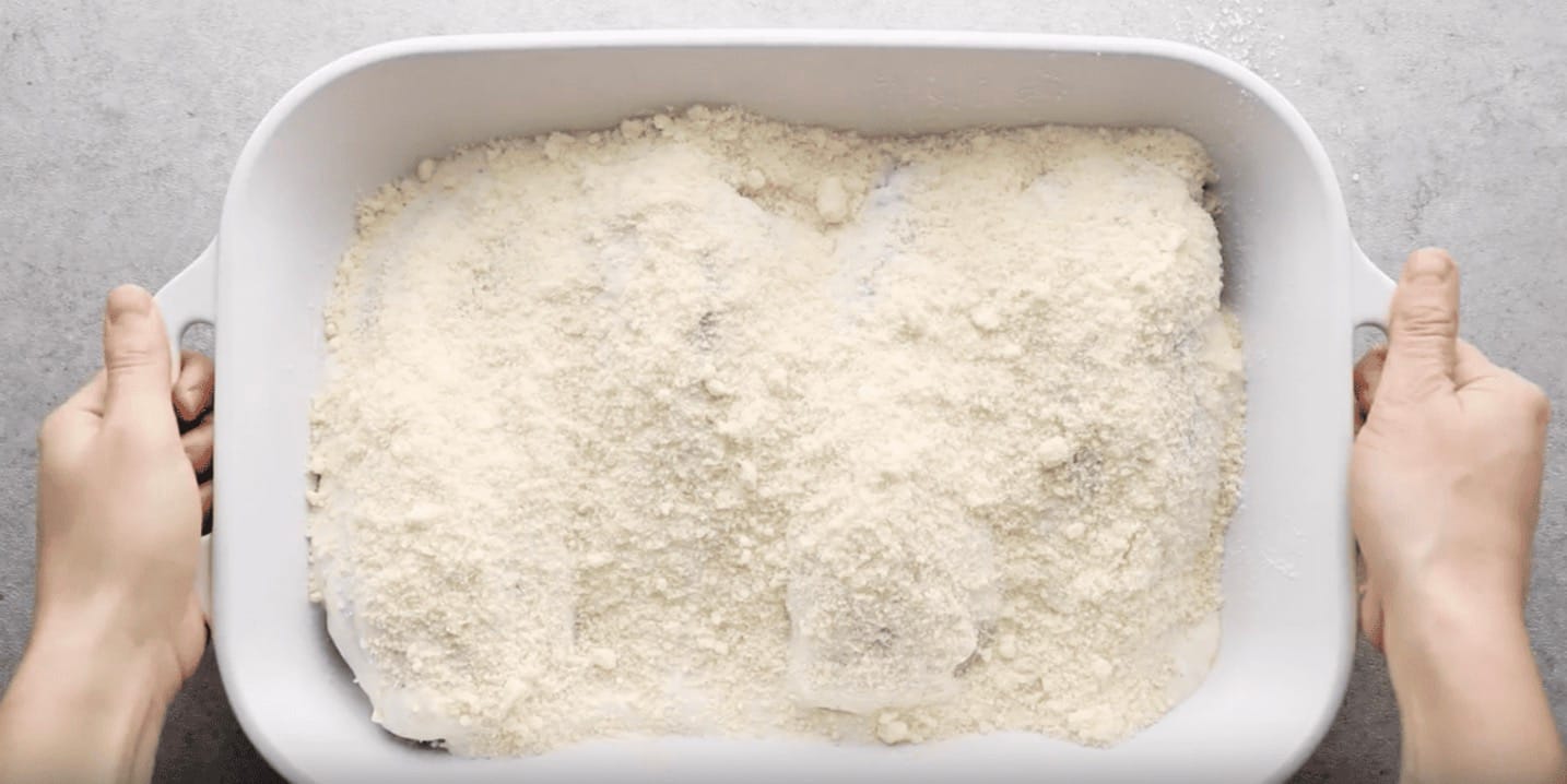 You’ll use most of the Parmesan cheese to coat the chicken. Save ½ cup to sprinkle on top before baking.