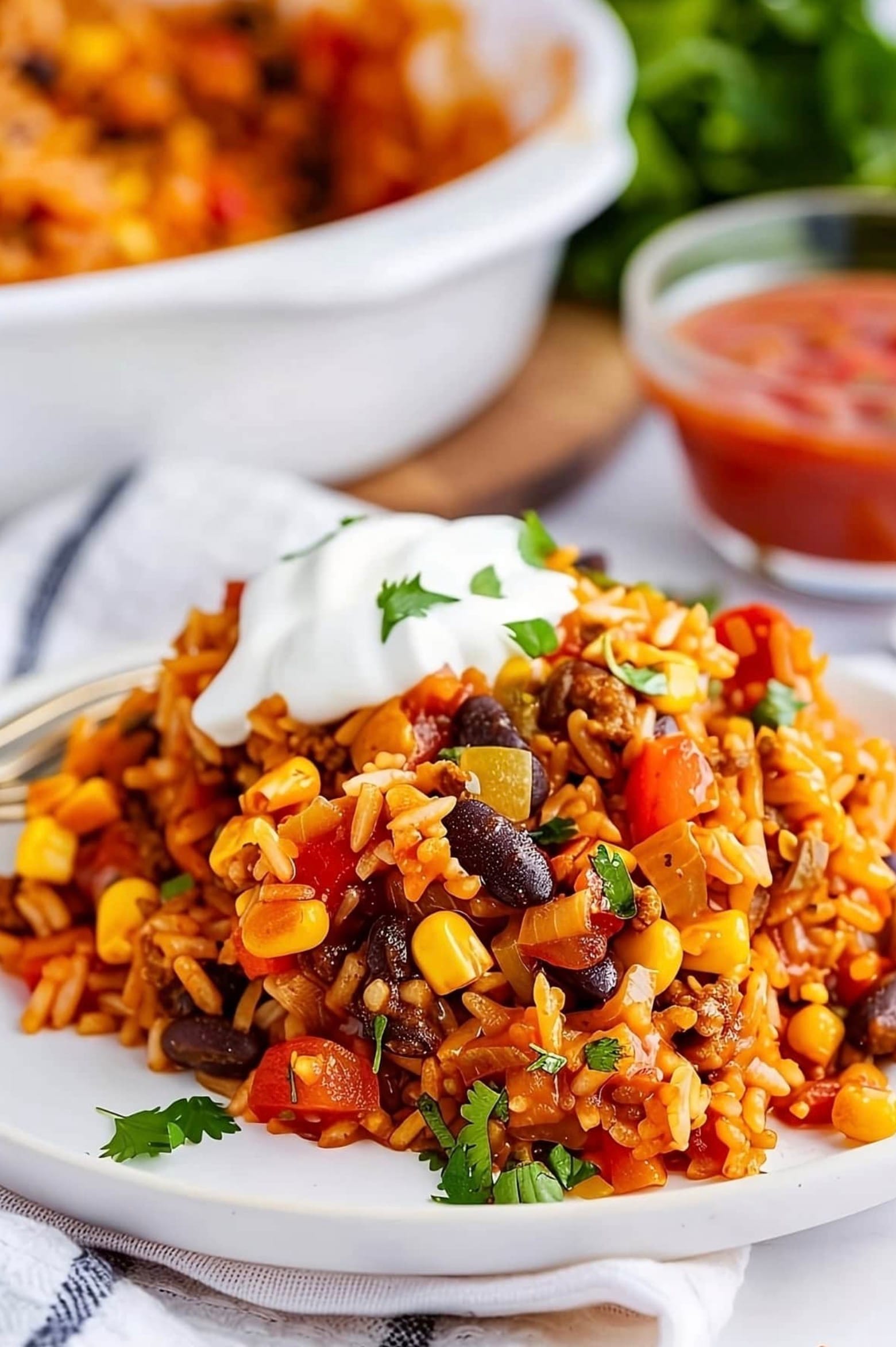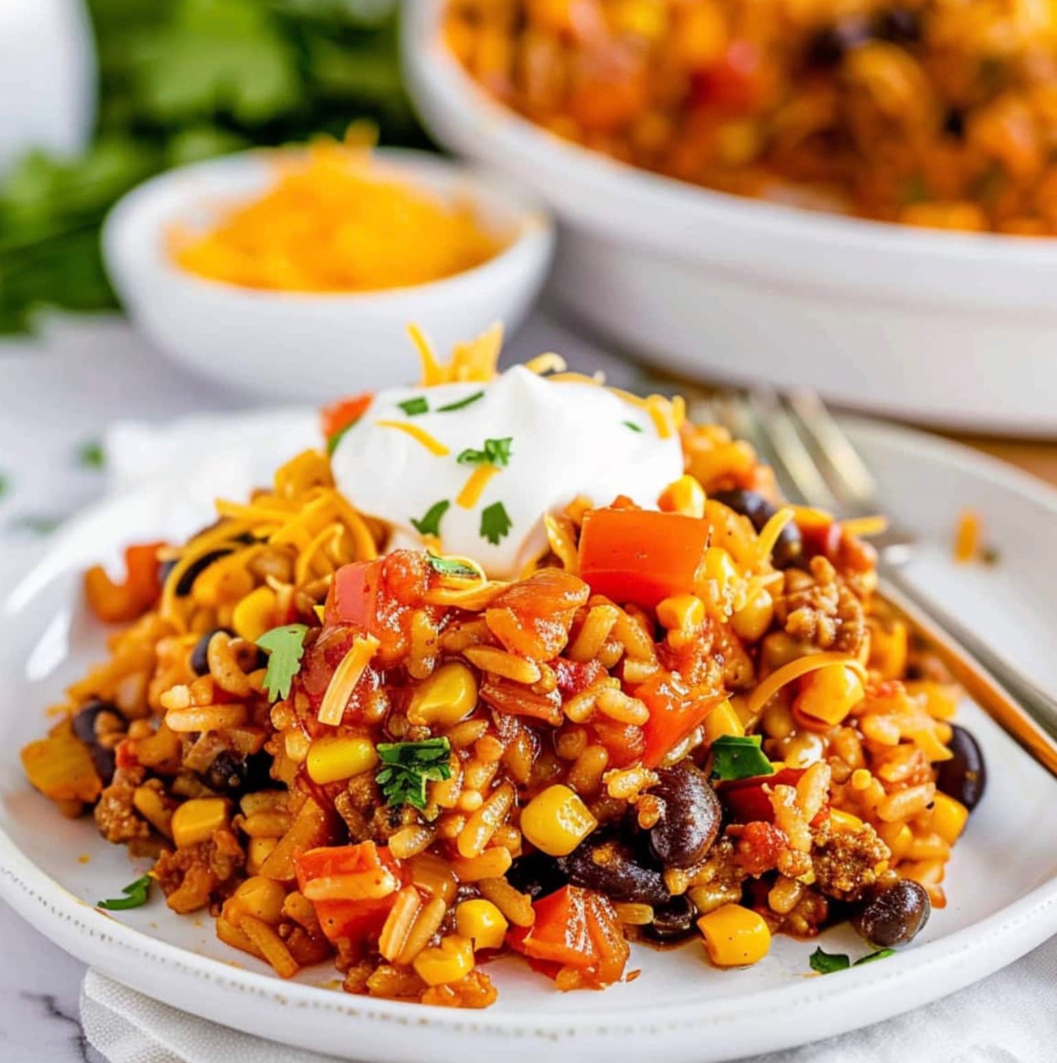 Serve it hot. Add toppings if you want – try cilantro, green onions, sour cream, or avocado. Enjoy your tasty Mexican rice casserole!