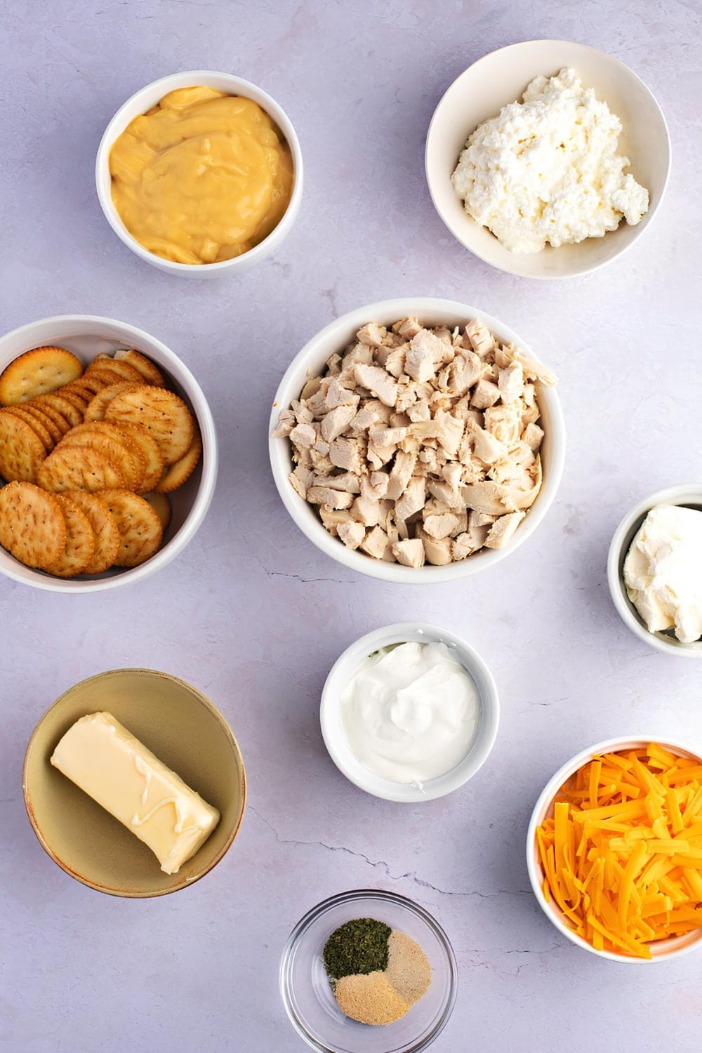 Mix the cheeses, sour cream, and soup in a big bowl. Add the spices and stir well. Fold in the chopped chicken until everything is combined.