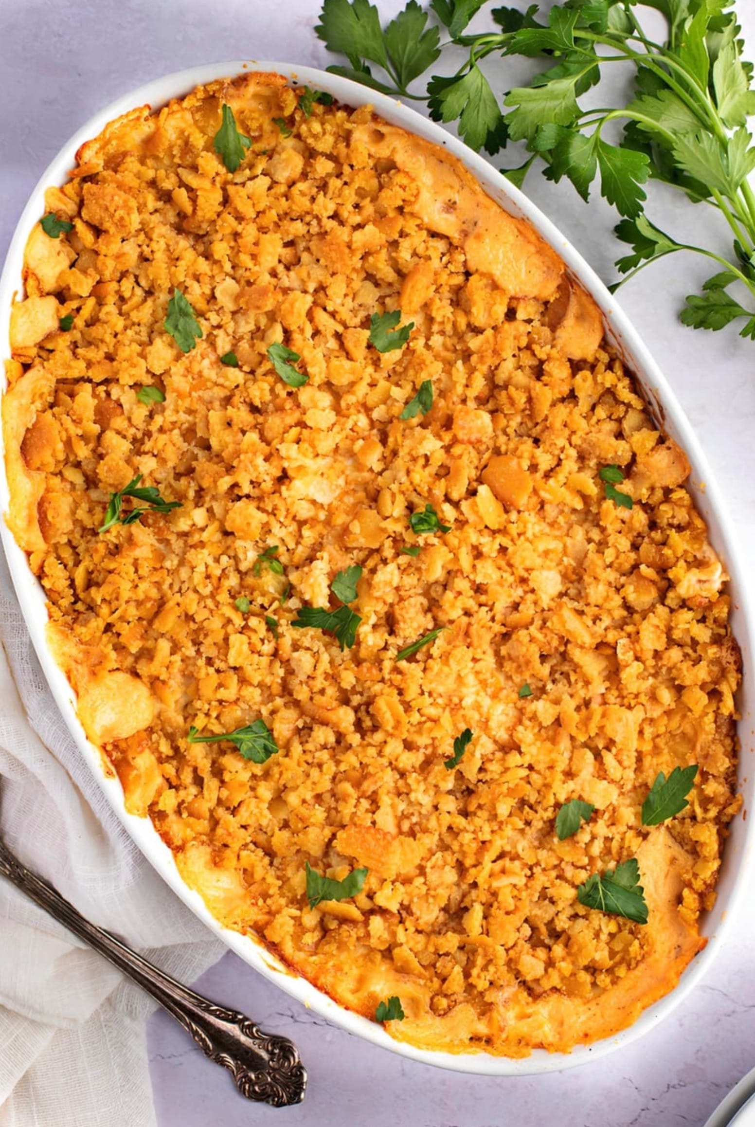 Sprinkle this cracker mix on top of your casserole. Pop it in the oven for 35-40 minutes.