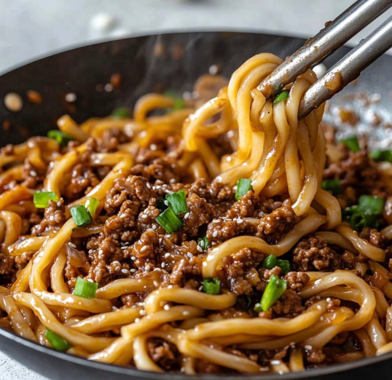 Add your cooked noodles to the skillet and toss until coated. Top with sliced green onions and sesame seeds. Your quick and tasty Mongolian ground beef noodles are ready to serve!