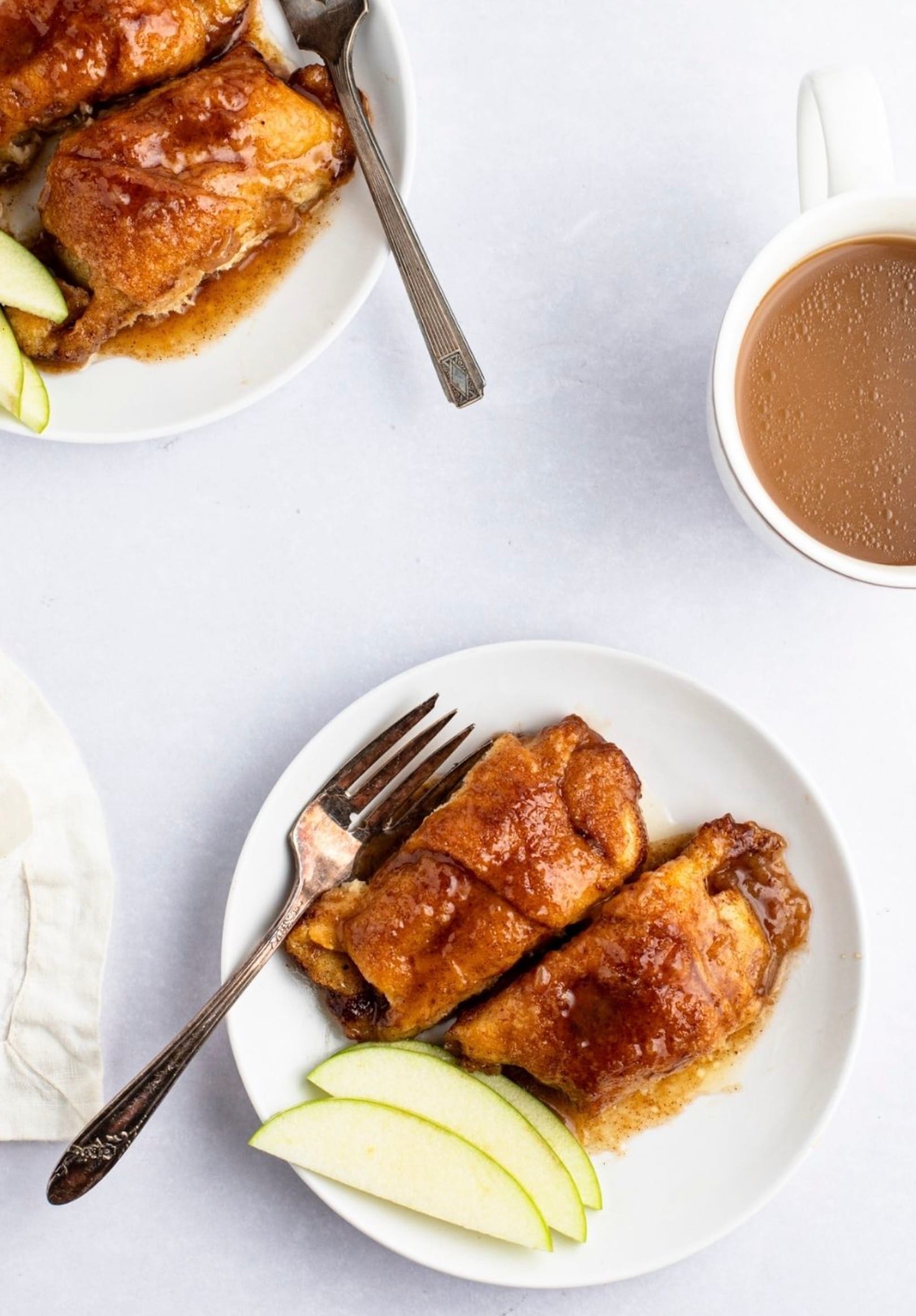 Unroll 2 cans of crescent roll dough on a lightly floured surface. Separate the dough into triangles. Place an apple wedge on the wide end of each triangle and roll it up like a croissant.