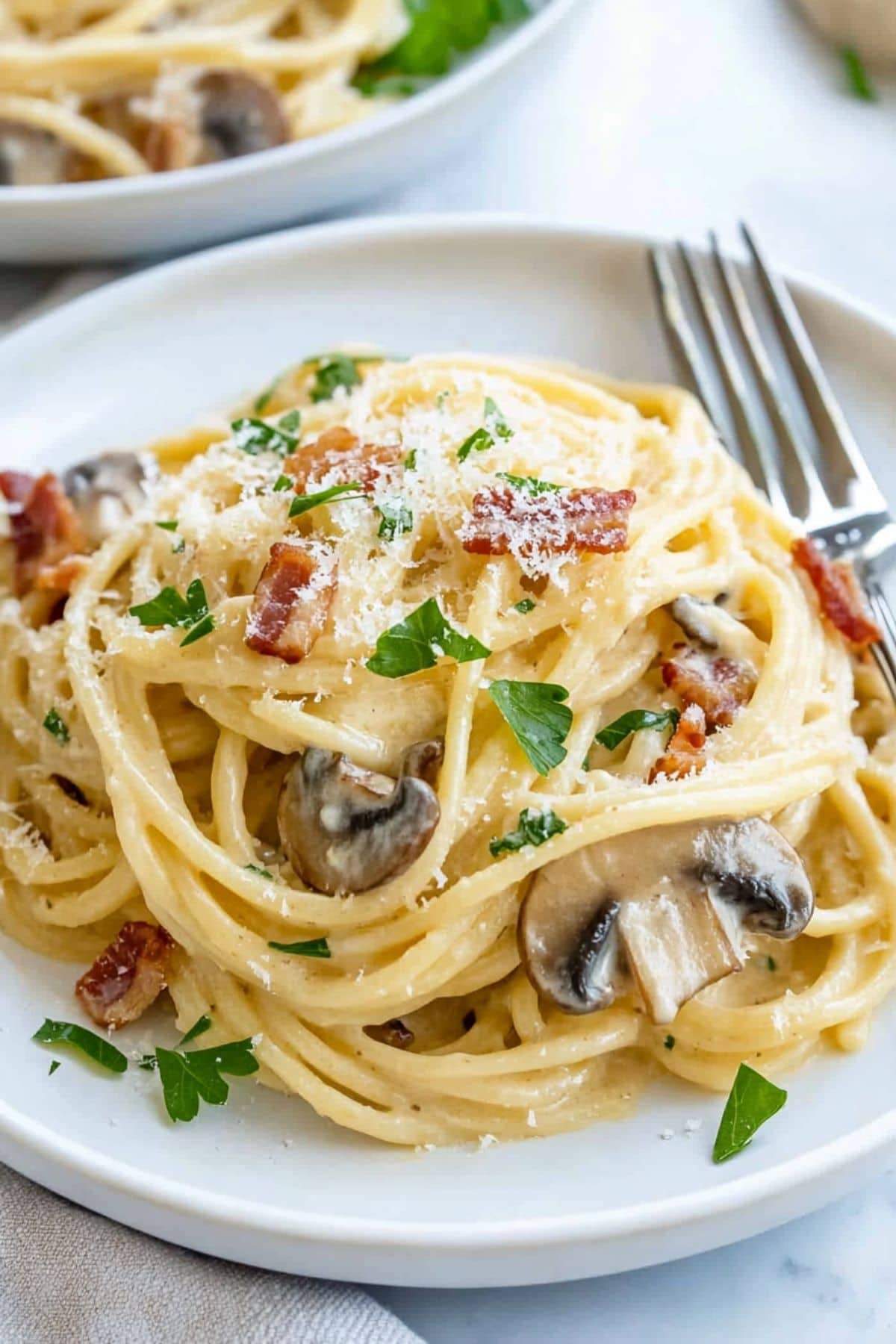 Serve your mushroom carbonara in bowls. Top with remaining pancetta and fresh parsley. Enjoy your delicious meal!