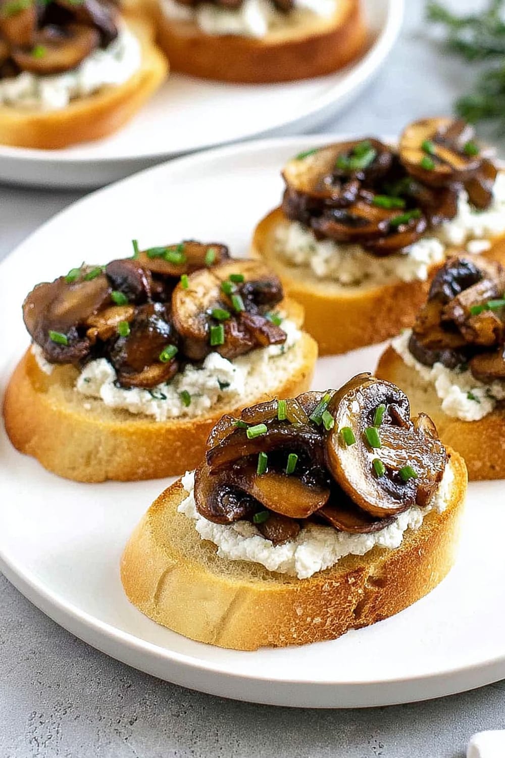 - 8 Using a butter knife or small offset spatula, spread about 2 teaspoons of the herbed goat cheese mixture over each toasted bread slice, creating an even layer that reaches the edges. Top each crostini with about 2 tablespoons of the caramelized onion and mushroom mixture, mounding it slightly in the center. Sprinkle with freshly cracked black pepper and additional chives for garnish. Arrange on a serving platter and serve immediately.