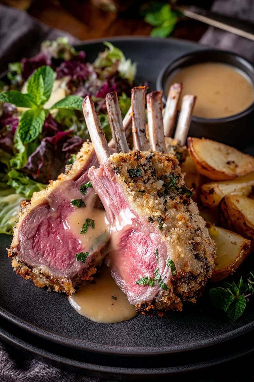 Roasted root vegetables like carrots, parsnips, and fingerling potatoes complement the lamb’s richness while adding earthy sweetness. Garlic and herb roasted asparagus provides a fresh contrast to the rich meat, while wild rice pilaf with dried cranberries adds texture and subtle sweetness. Creamy polenta or cauliflower mash creates a luxurious base that soaks up the mint butter sauce beautifully.
