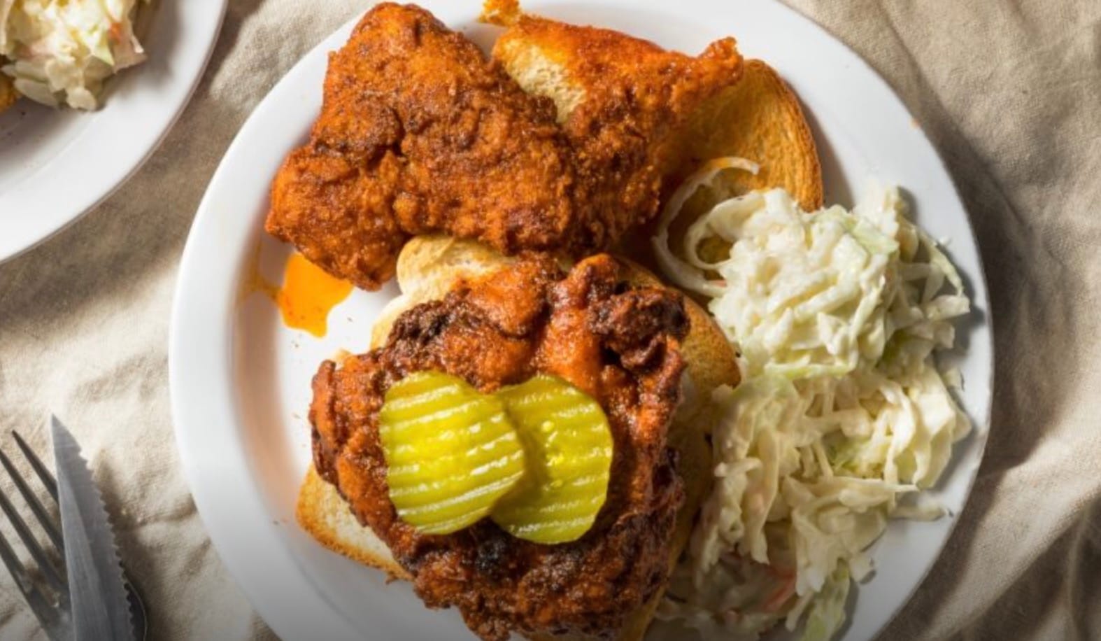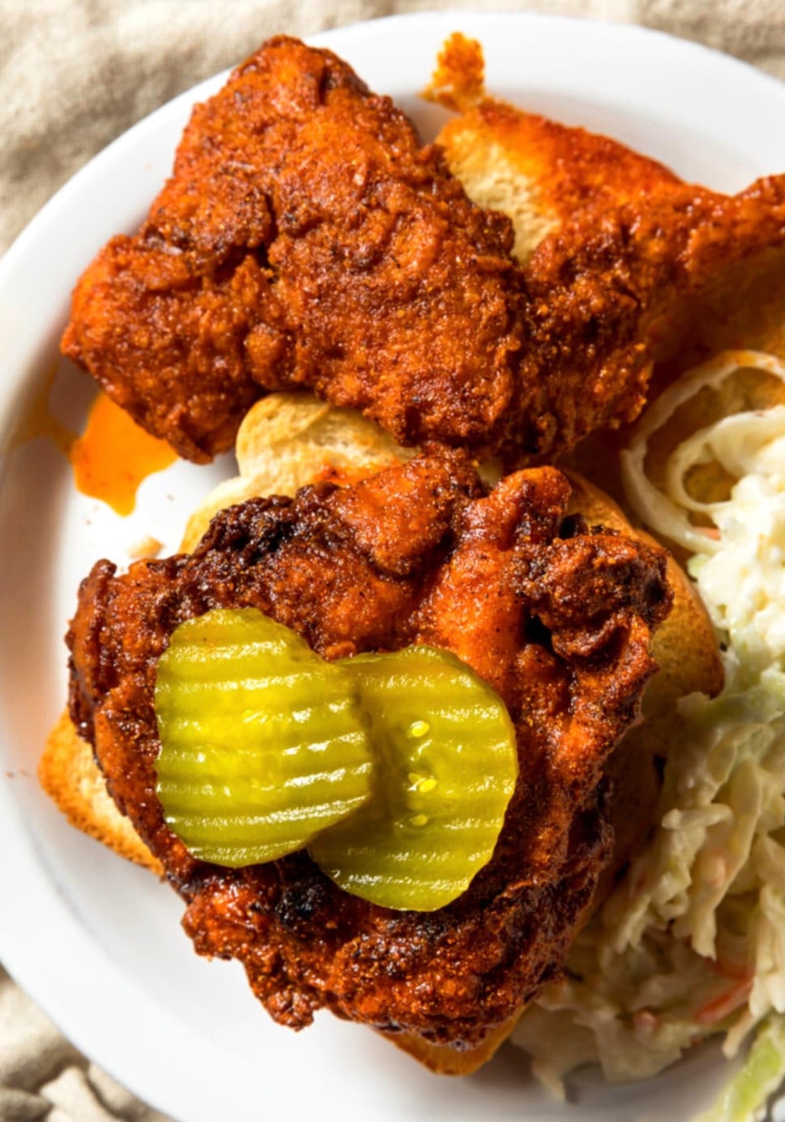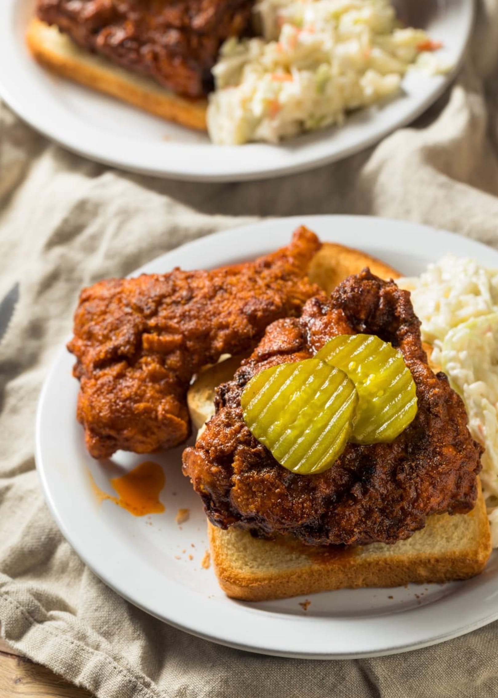 Serve your hot chicken with classic sides like pickles and white bread. They help balance out the heat!