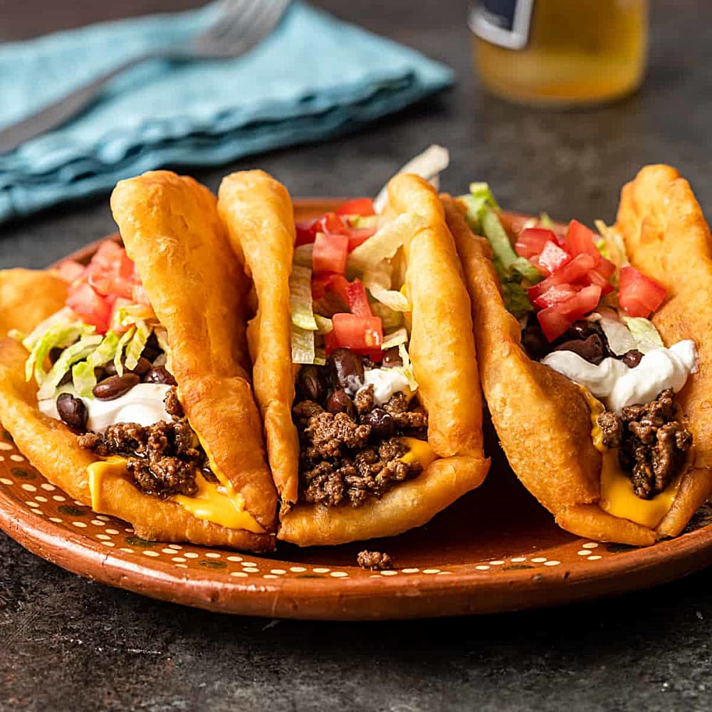 Navajo tacos take everything you love about traditional tacos and pile it high on golden, crispy fry bread that’s basically a fluffy cloud of deliciousness.