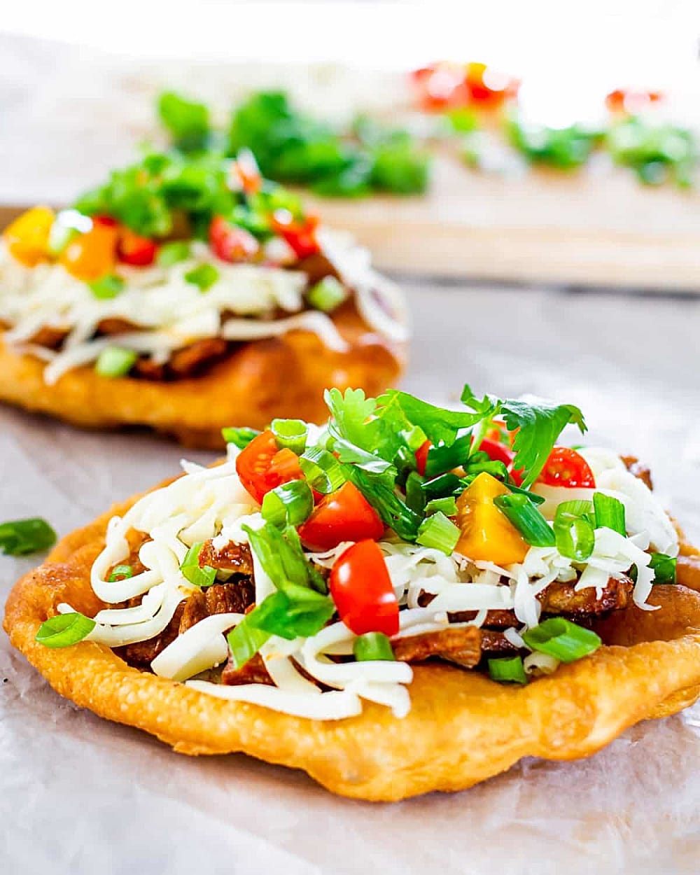- To assemble, place one warm fry bread on each plate and top with 1/2 cup of the hot meat mixture. The contrast between the crispy-yet-soft bread and the savory topping is what makes this dish special. Load up with your favorite toppings – the more colorful, the better!