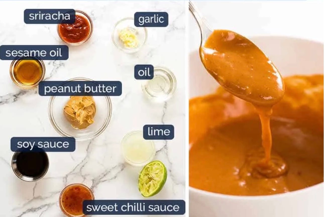Now for the yummy dressing. Mix peanut butter, sesame oil, canola oil, soy sauce, sweet chili sauce, sriracha, lime juice, and minced garlic in a bowl. Add a bit of water if it’s too thick.
