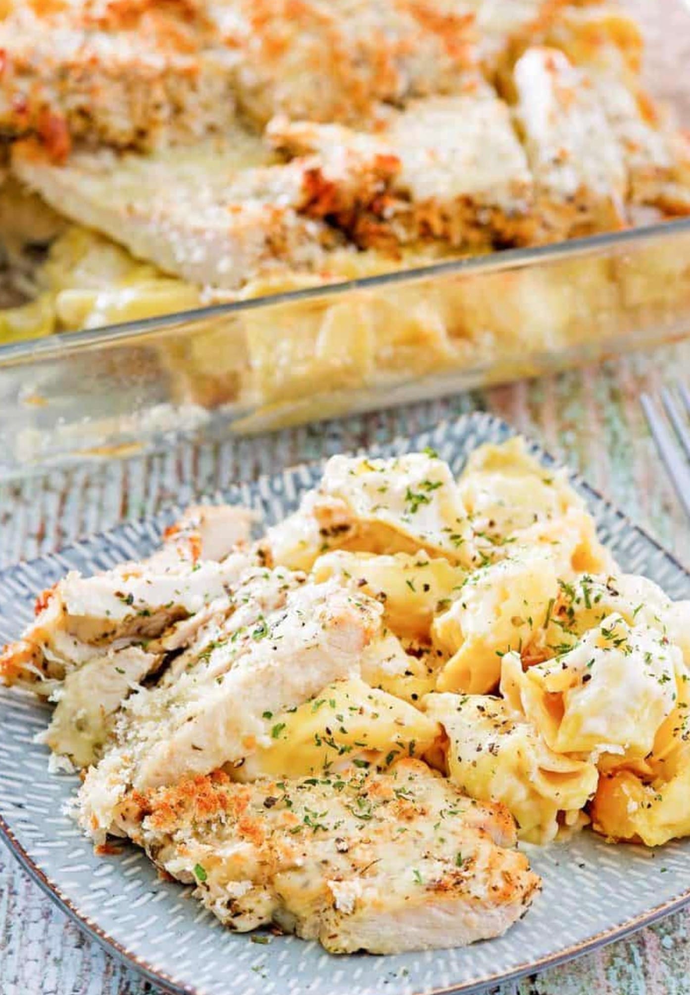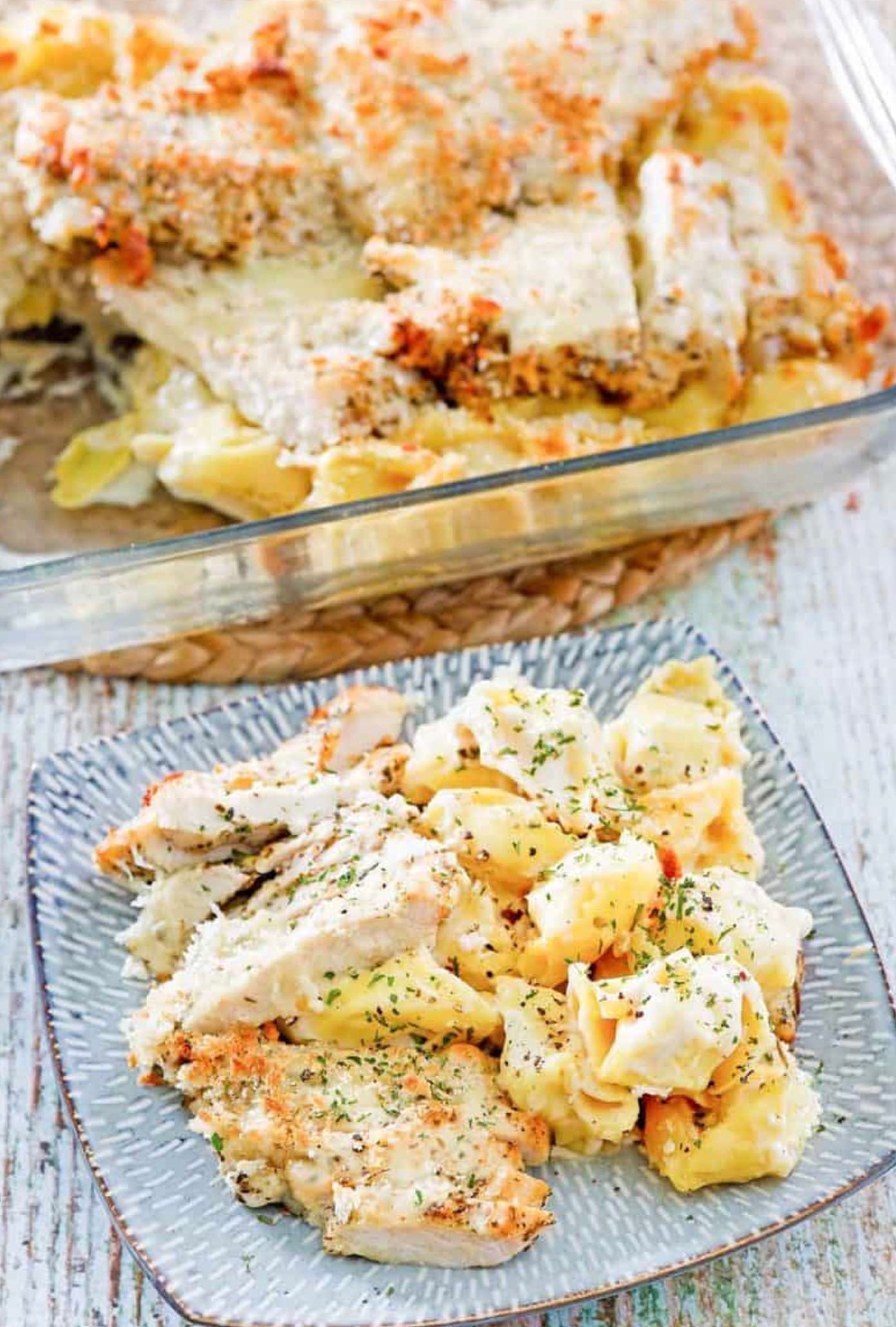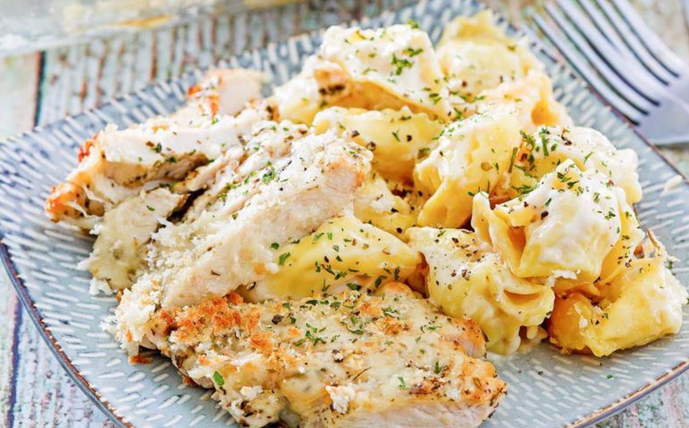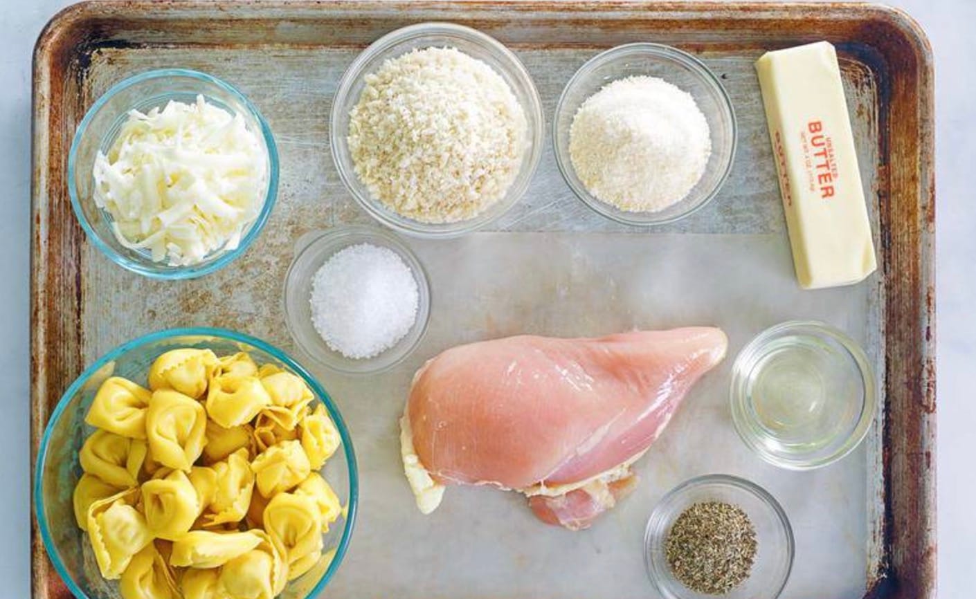 You’ll need boneless chicken breasts, refrigerated tortellini, and ingredients for a rich Alfredo sauce. The dish is finished with a crispy panko and mozzarella topping for extra flavor and crunch.