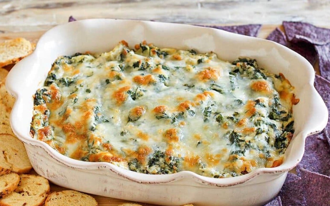 The dip starts with a butter and flour roux, then adds milk and cheese for a rich base. Spinach and artichokes give it texture and flavor. After mixing everything together, you’ll top it with more cheese and broil until golden brown. Serve it warm with bread or chips for a crowd-pleasing snack.