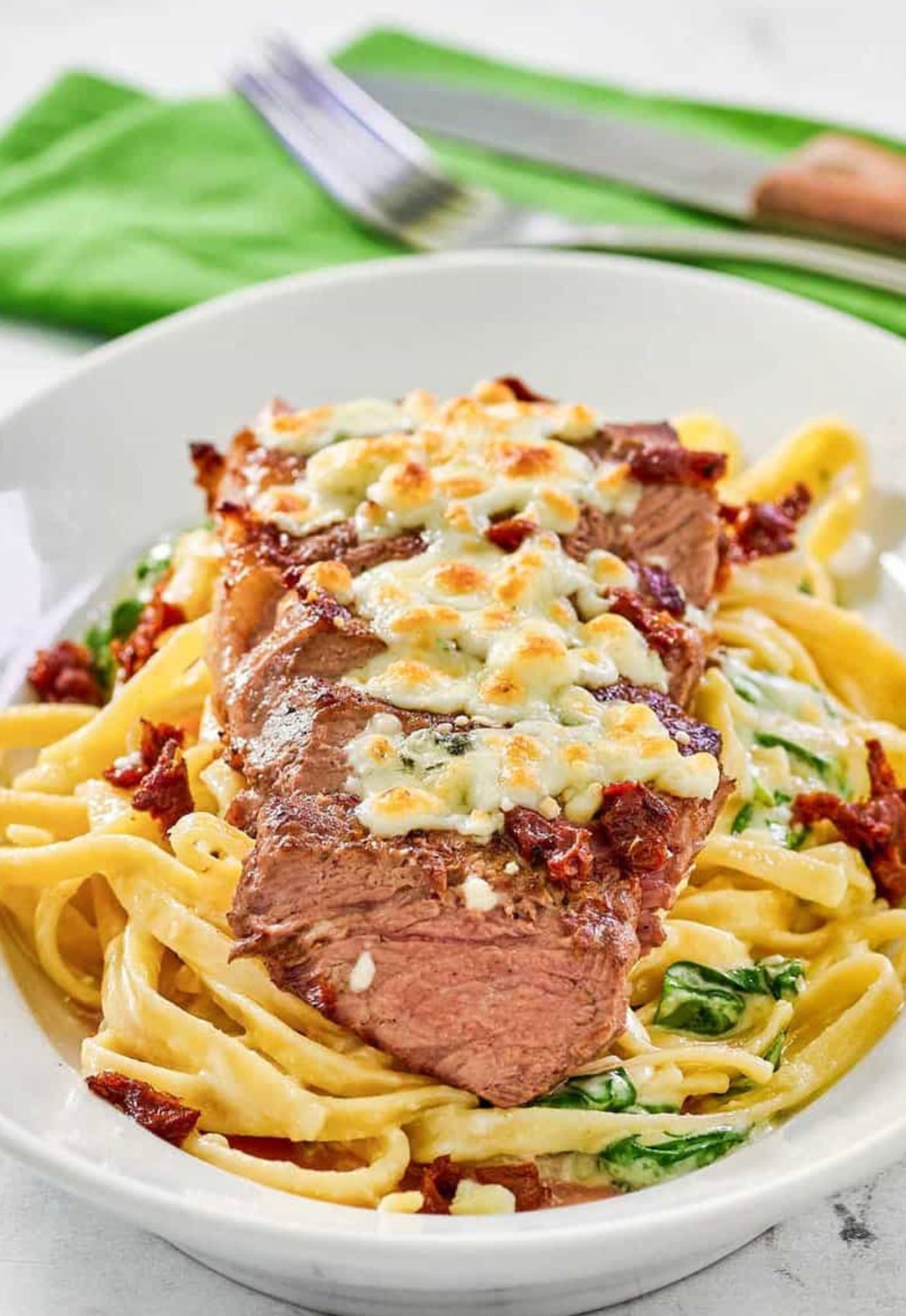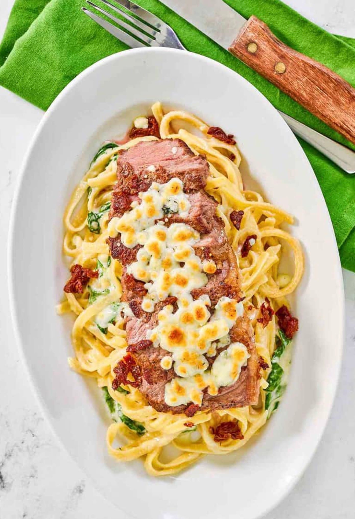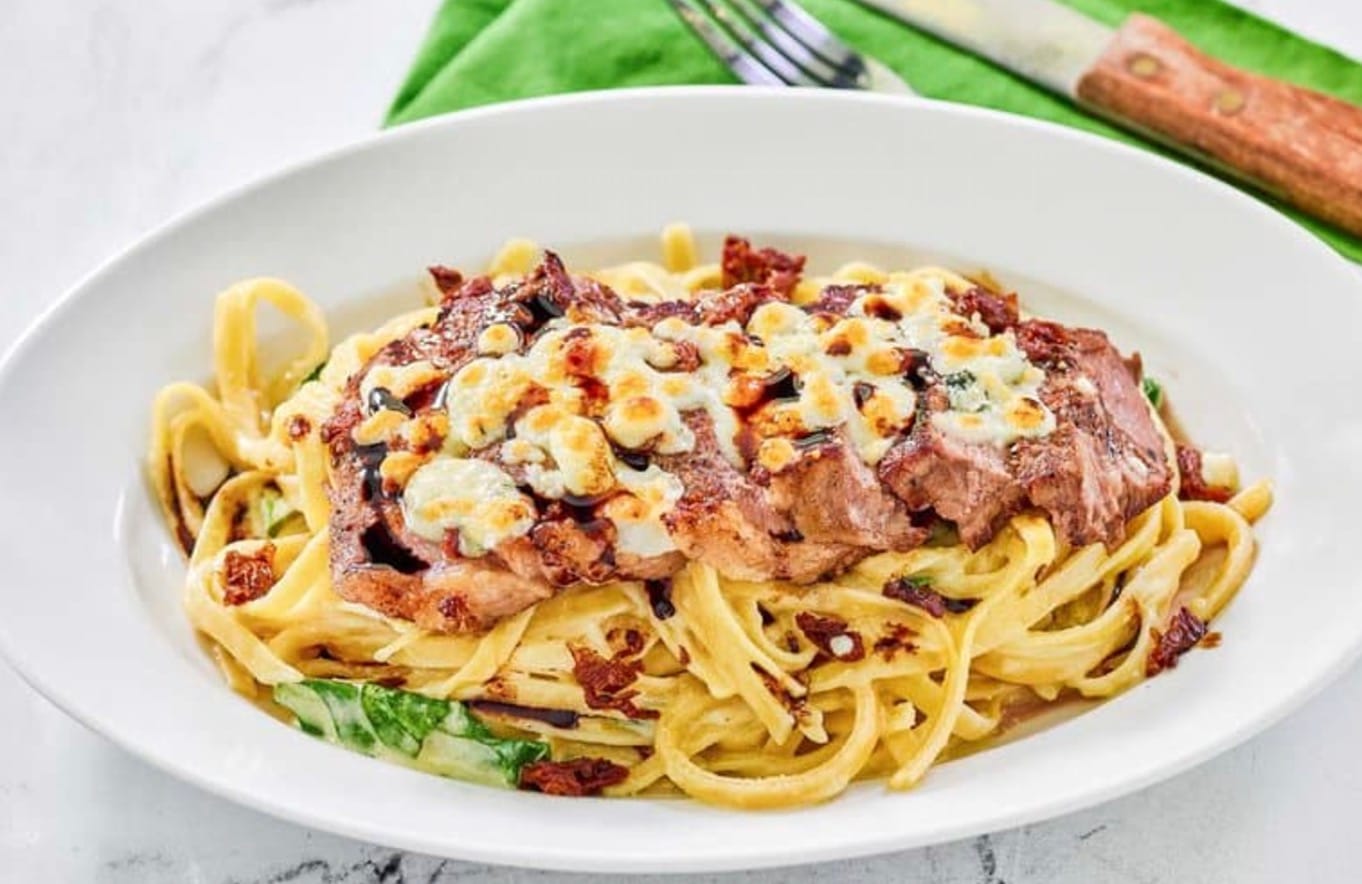 The dish features juicy steak served over fettuccine pasta tossed in a rich Parmesan Alfredo sauce. It’s topped with crumbled Gorgonzola, sundried tomatoes, and a drizzle of balsamic glaze for extra flavor. You’ll love how the different tastes and textures come together in this satisfying meal.