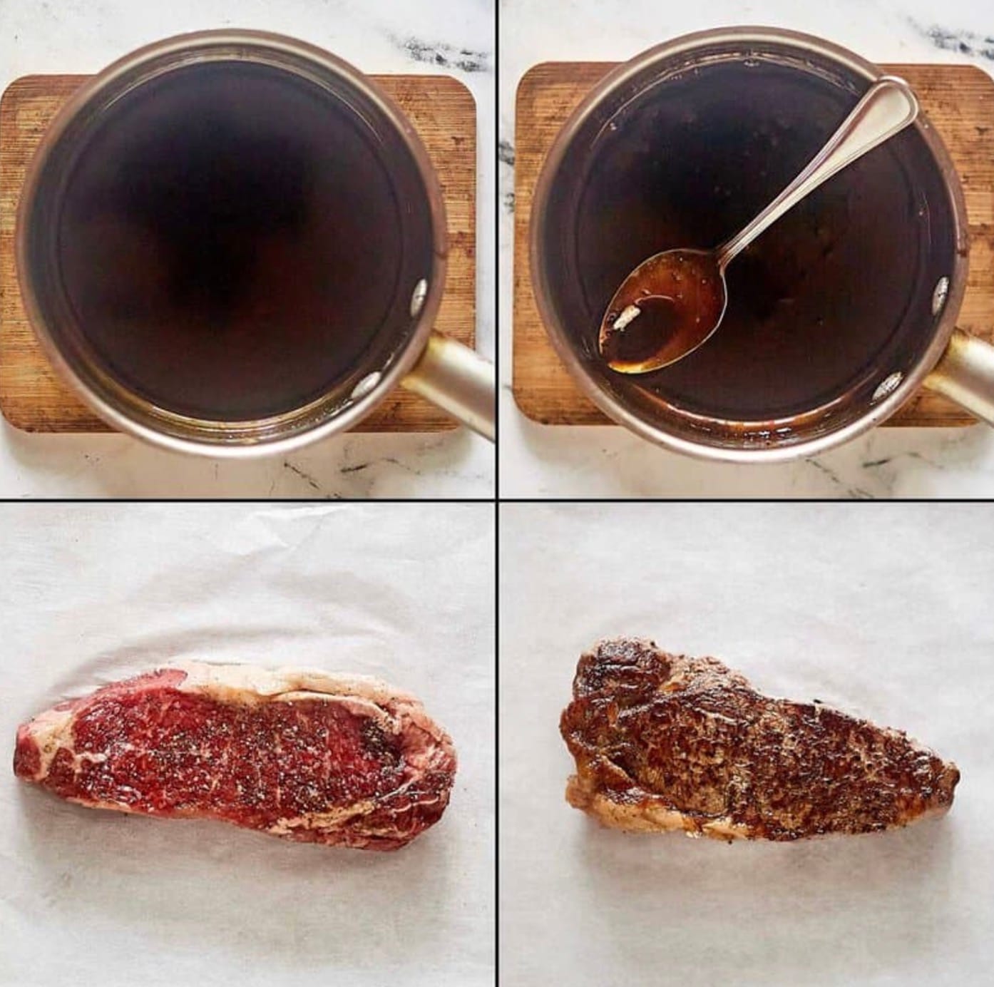 Season your steak with salt and pepper. Cook it in a hot skillet with oil to your liking. Remove and let it rest.