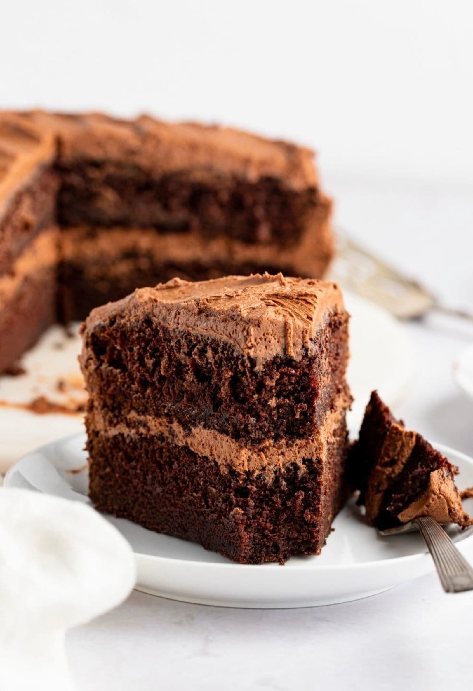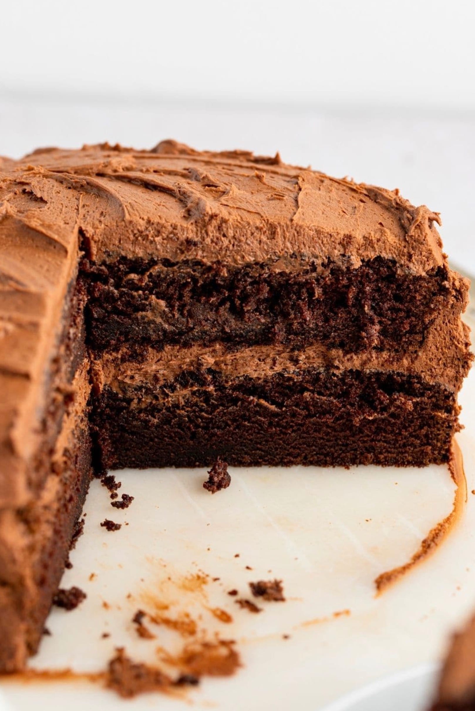 The recipe makes a big 9-inch layer cake that serves 24 people. You’ll only need about 30 minutes to mix it up and 20 minutes to bake. The hardest part is waiting for it to cool before frosting! With rich cocoa flavor and a creamy chocolate frosting, this cake is sure to be a hit at your next party or family gathering.