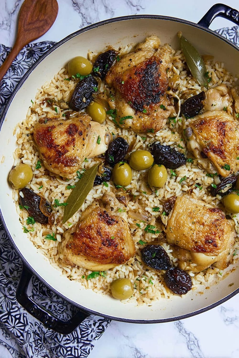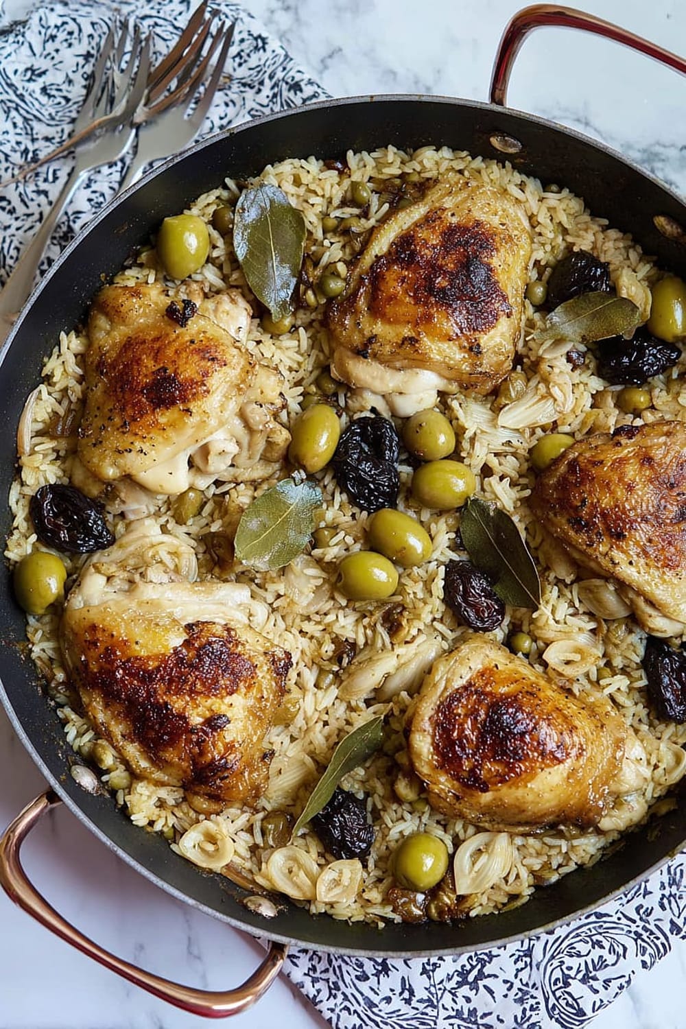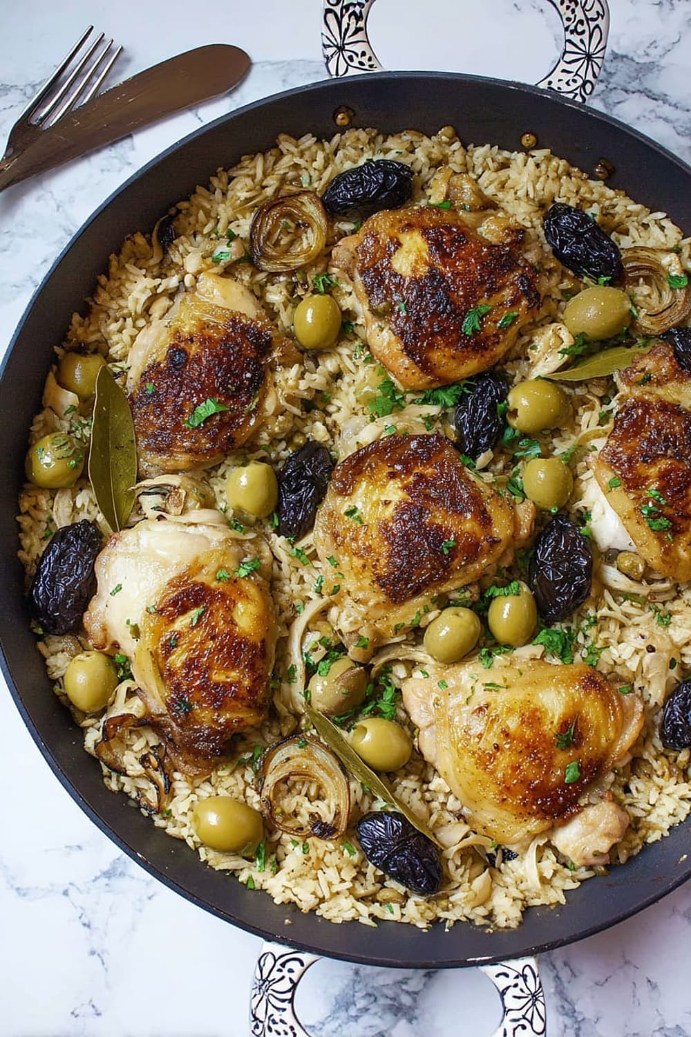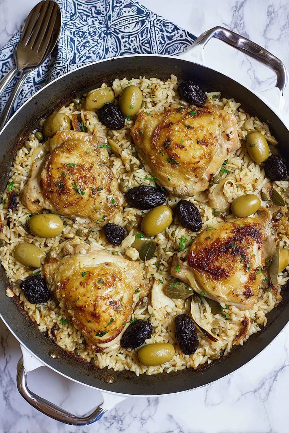 Picture this: tender chicken thighs with crispy skin nestled in a bed of perfectly cooked rice that’s absorbed all those incredible Mediterranean flavors from olives, capers, and sweet prunes.