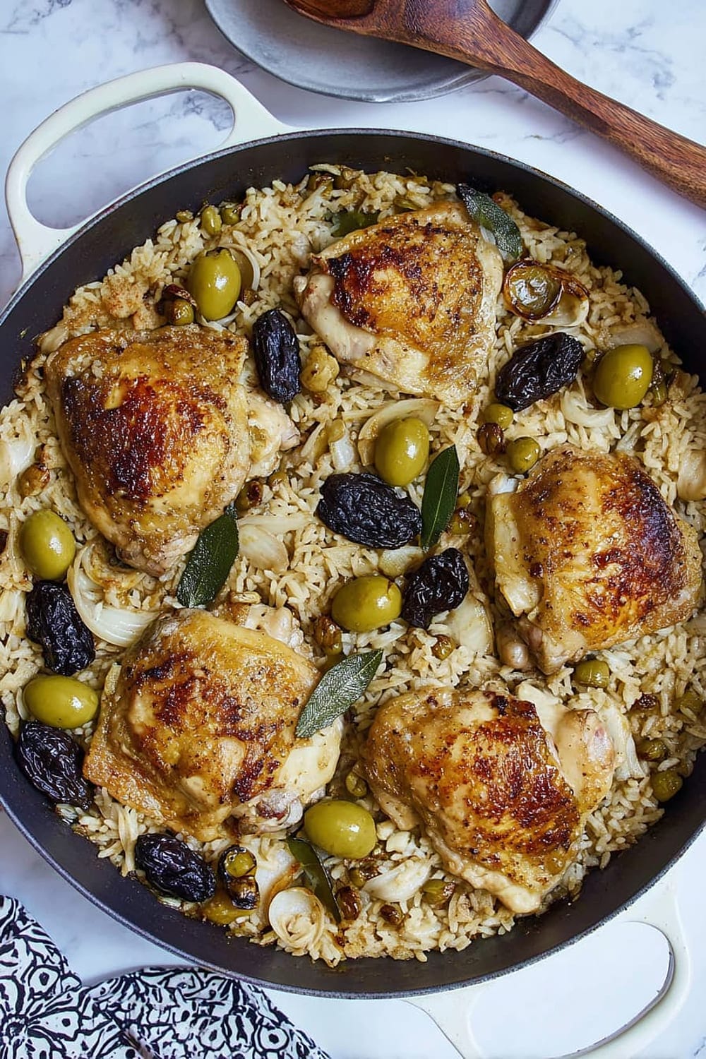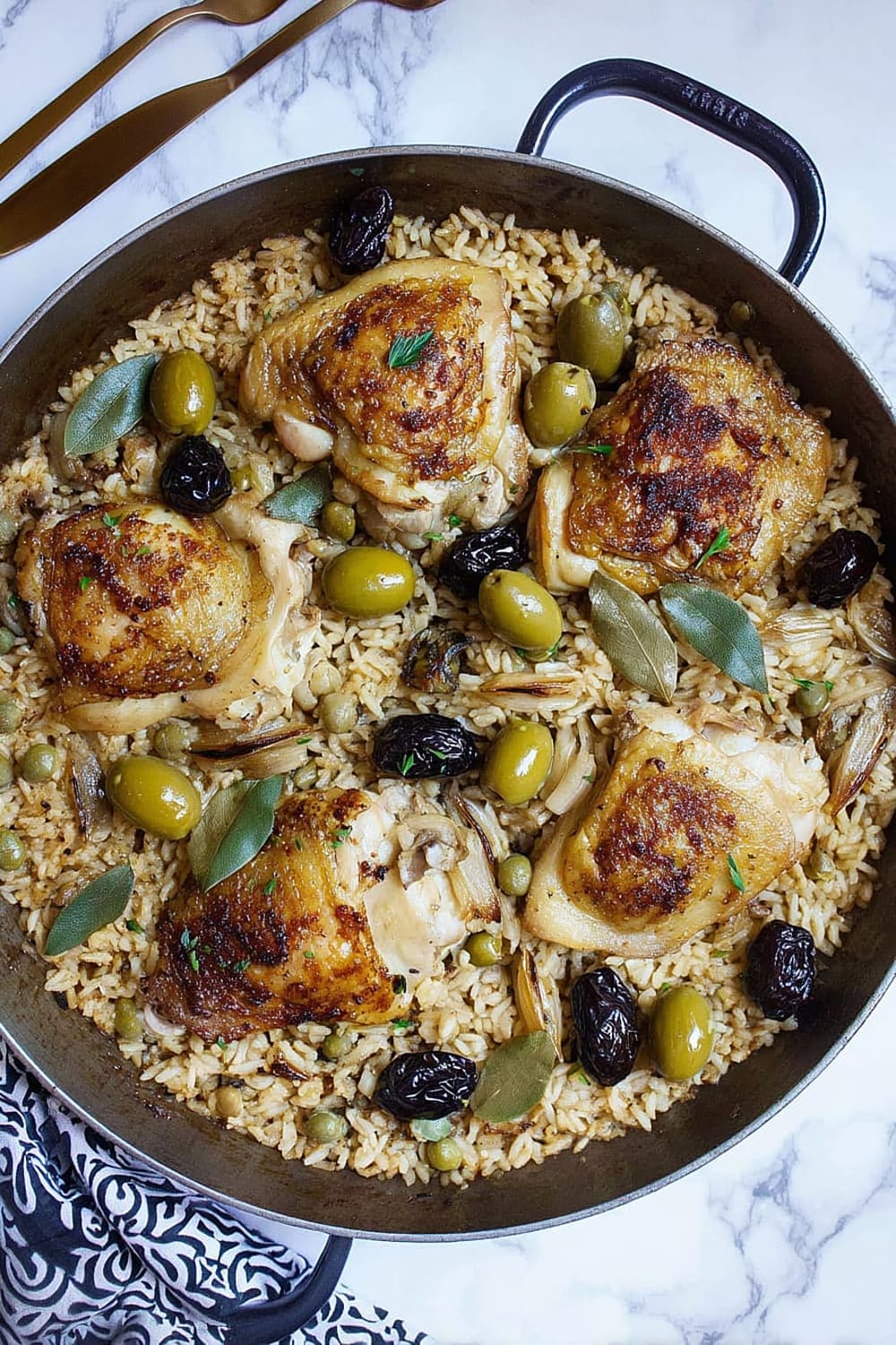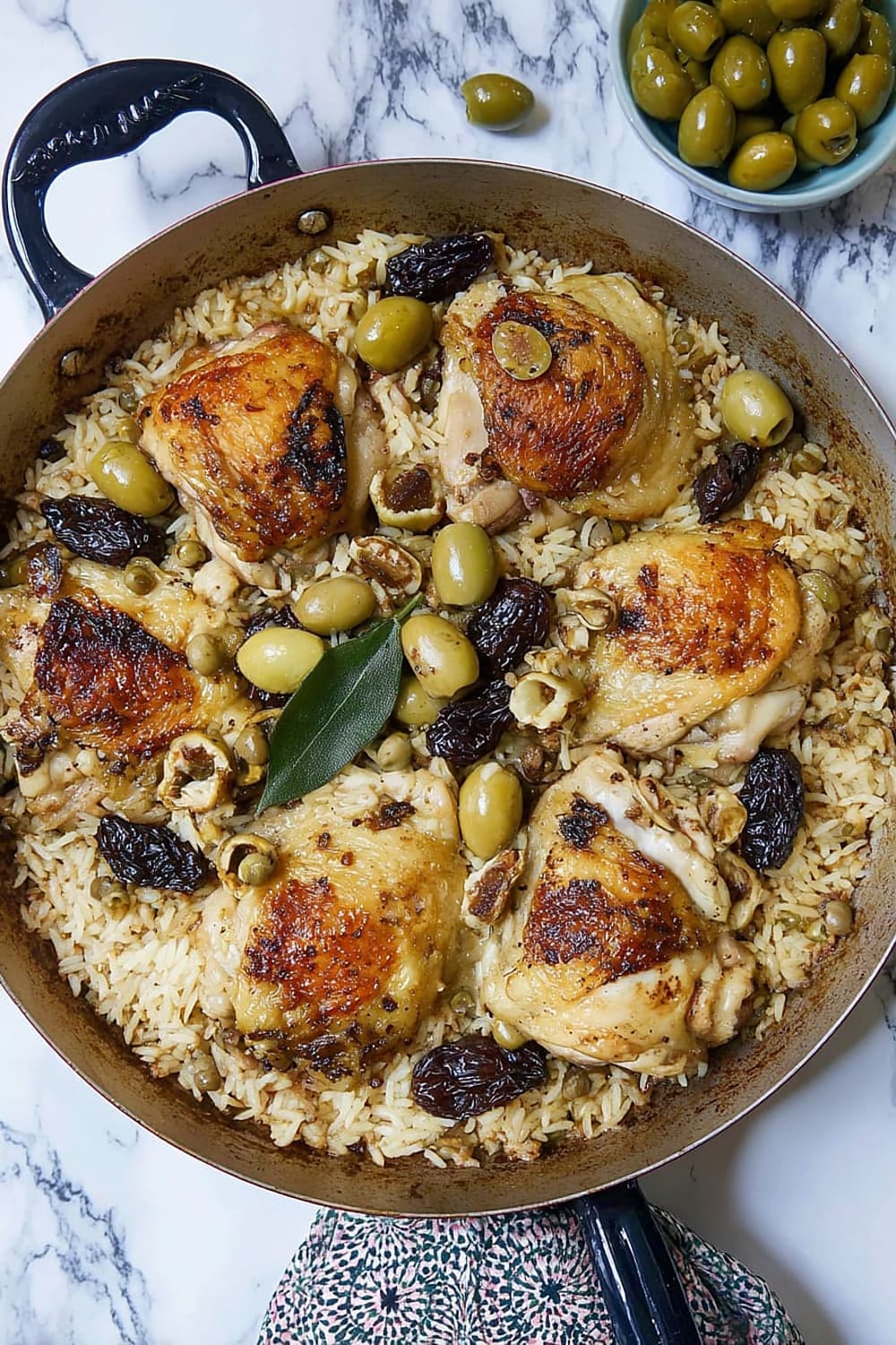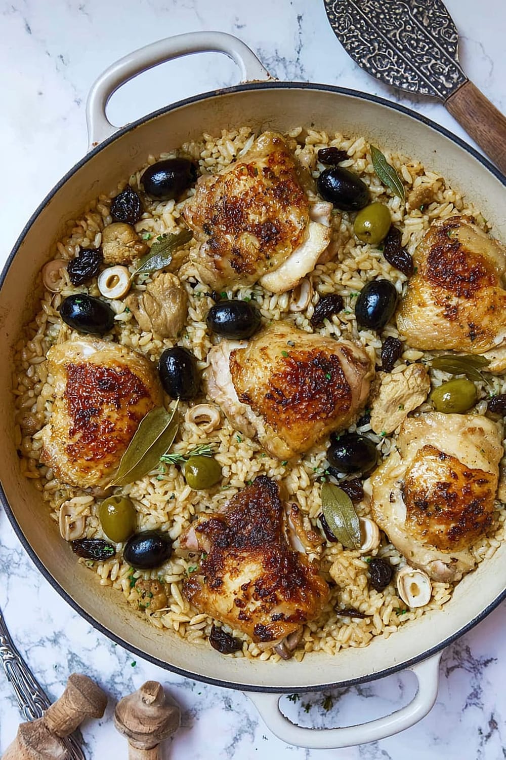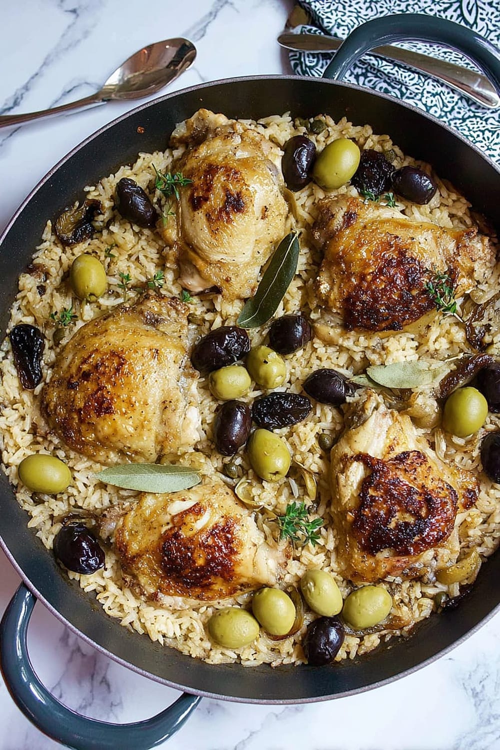 Picture this: tender chicken thighs with crispy skin nestled in a bed of perfectly cooked rice that’s absorbed all those incredible Mediterranean flavors from olives, capers, and sweet prunes.