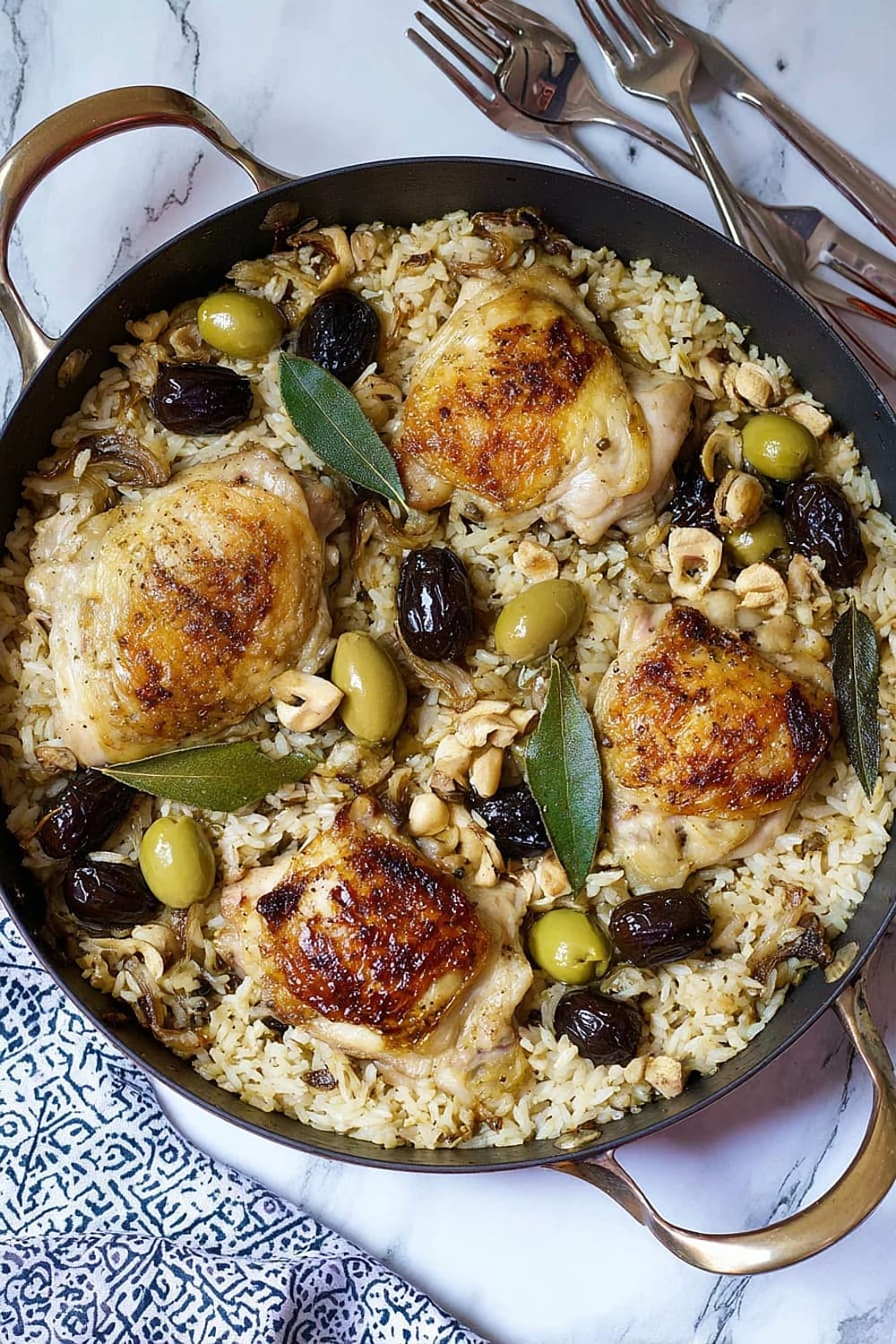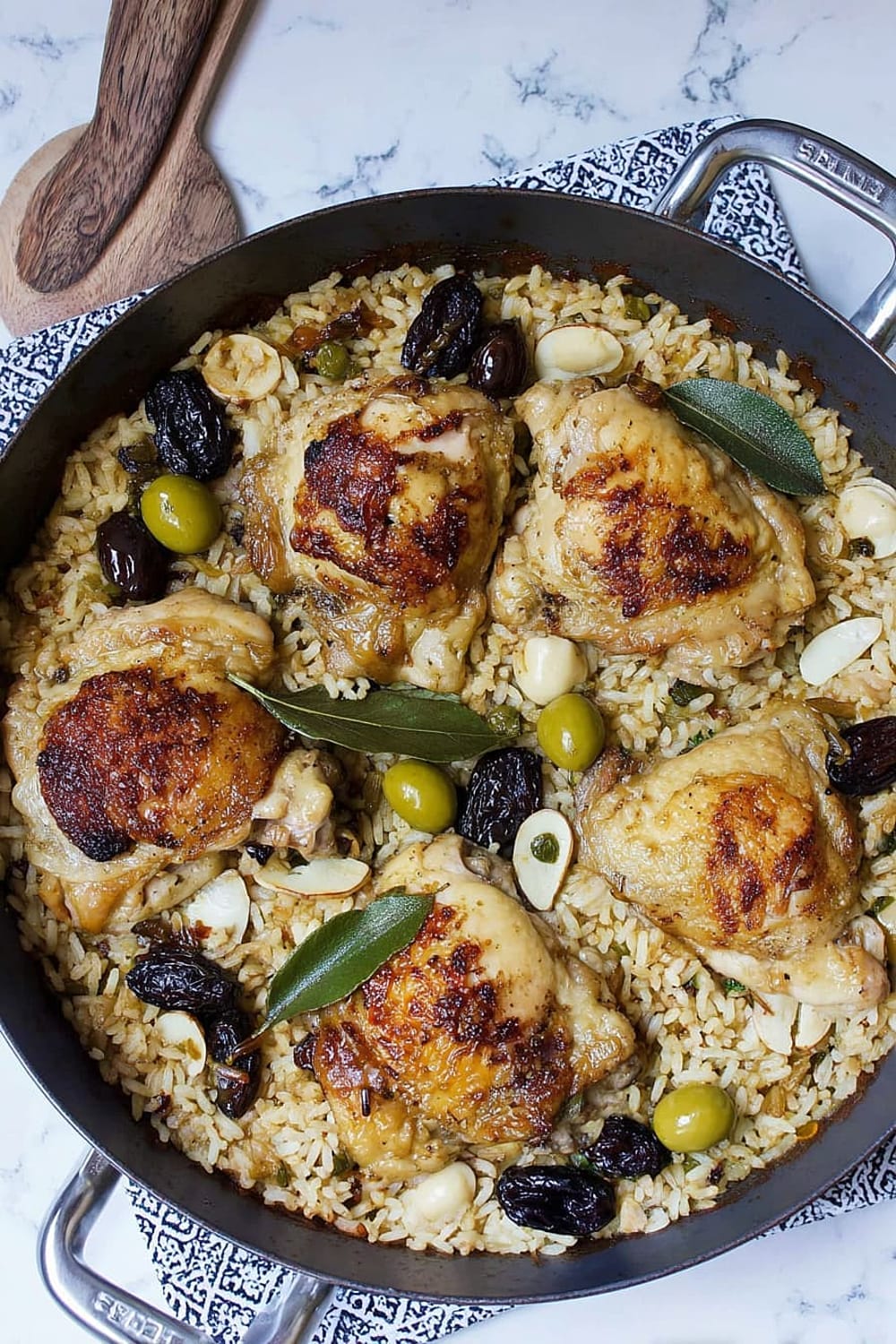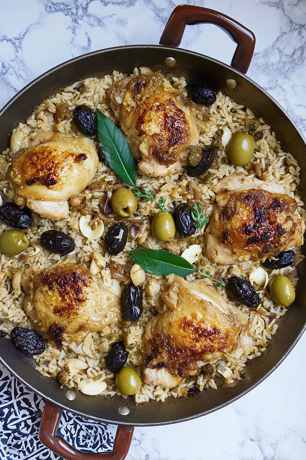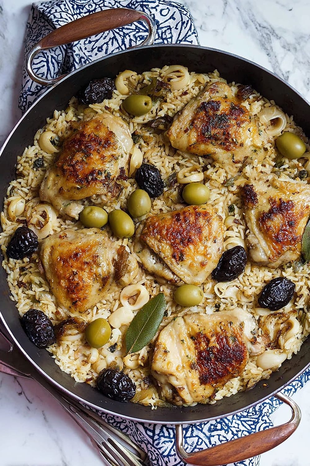 Picture this: tender chicken thighs with crispy skin nestled in a bed of perfectly cooked rice that’s absorbed all those incredible Mediterranean flavors from olives, capers, and sweet prunes.