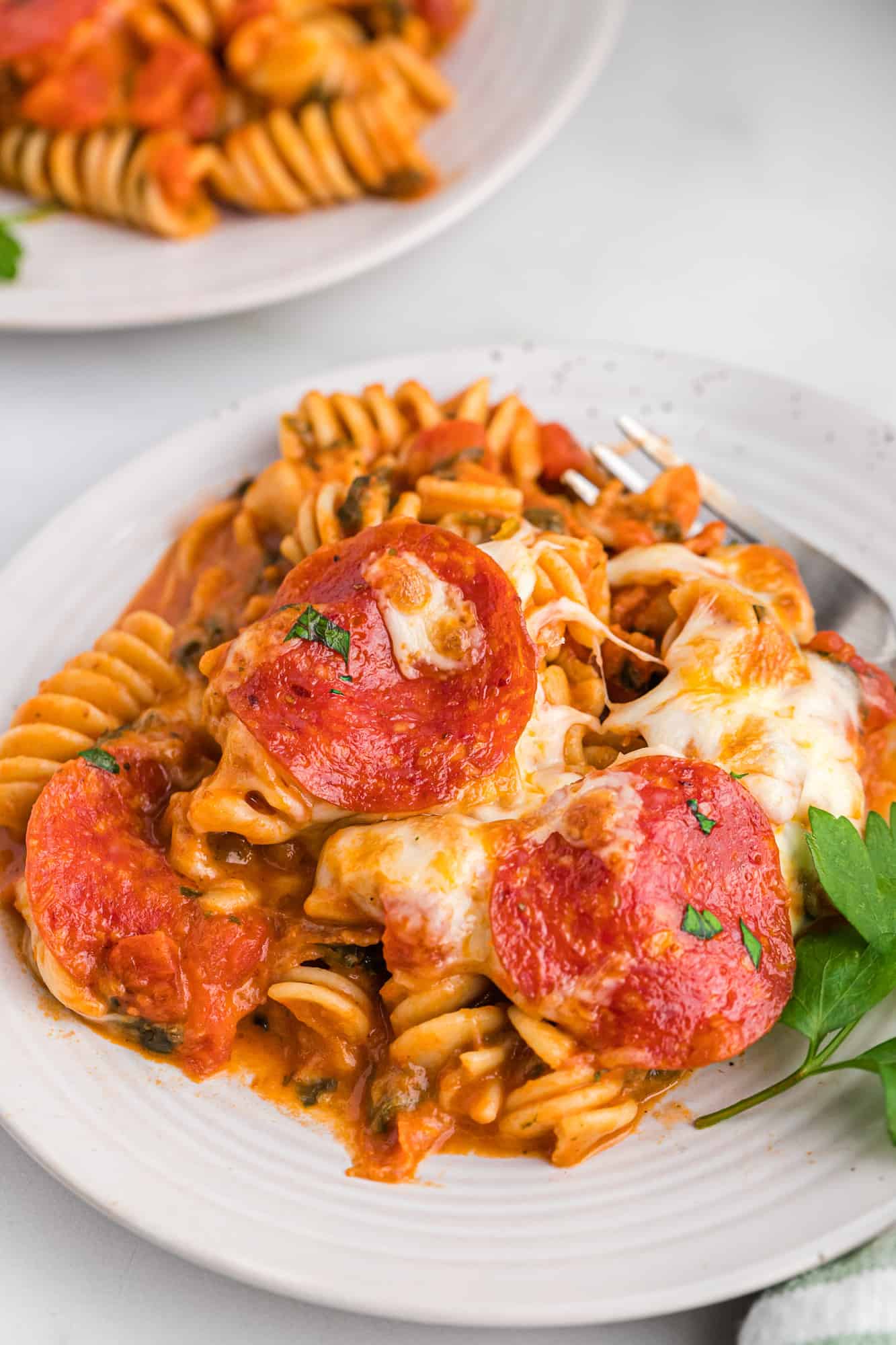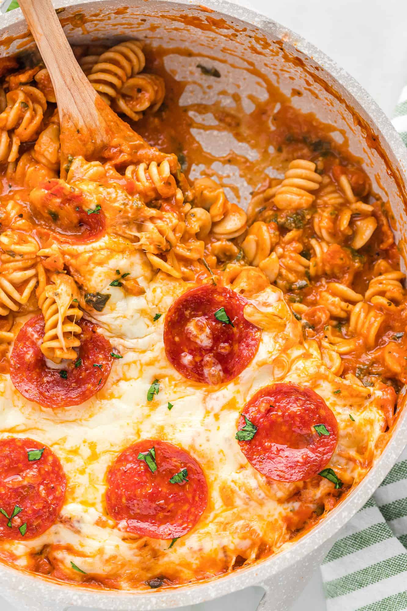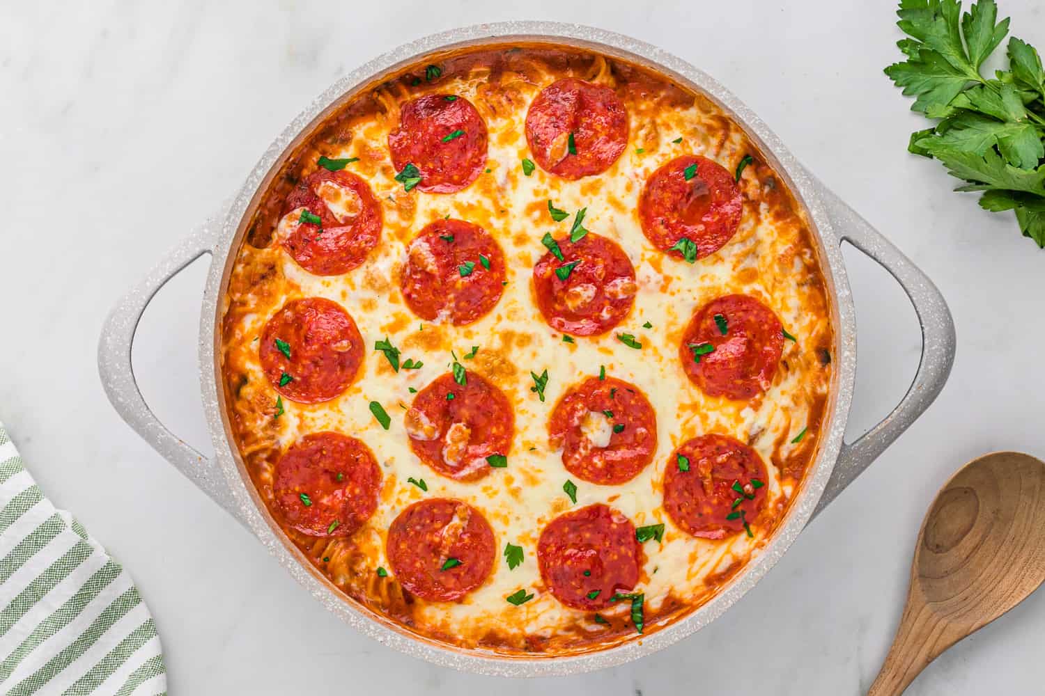 Sprinkle on some fresh parsley or basil if you’re feeling fancy. Then dig in and enjoy your one-pan pizza pasta!