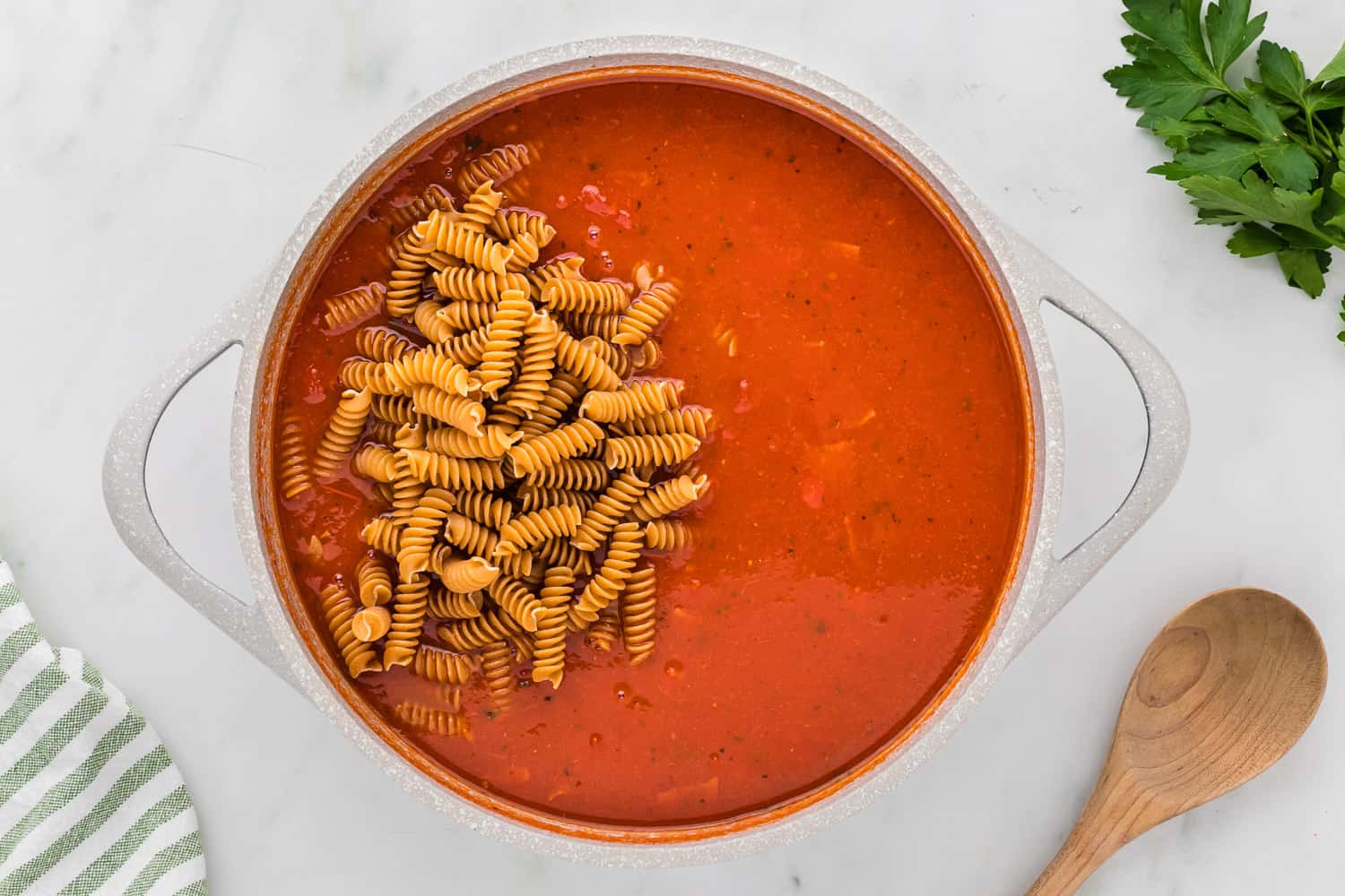 Add your pasta once it’s bubbling. Turn the heat down to medium and cover the pan. Let it cook for 8-10 minutes, stirring now and then.