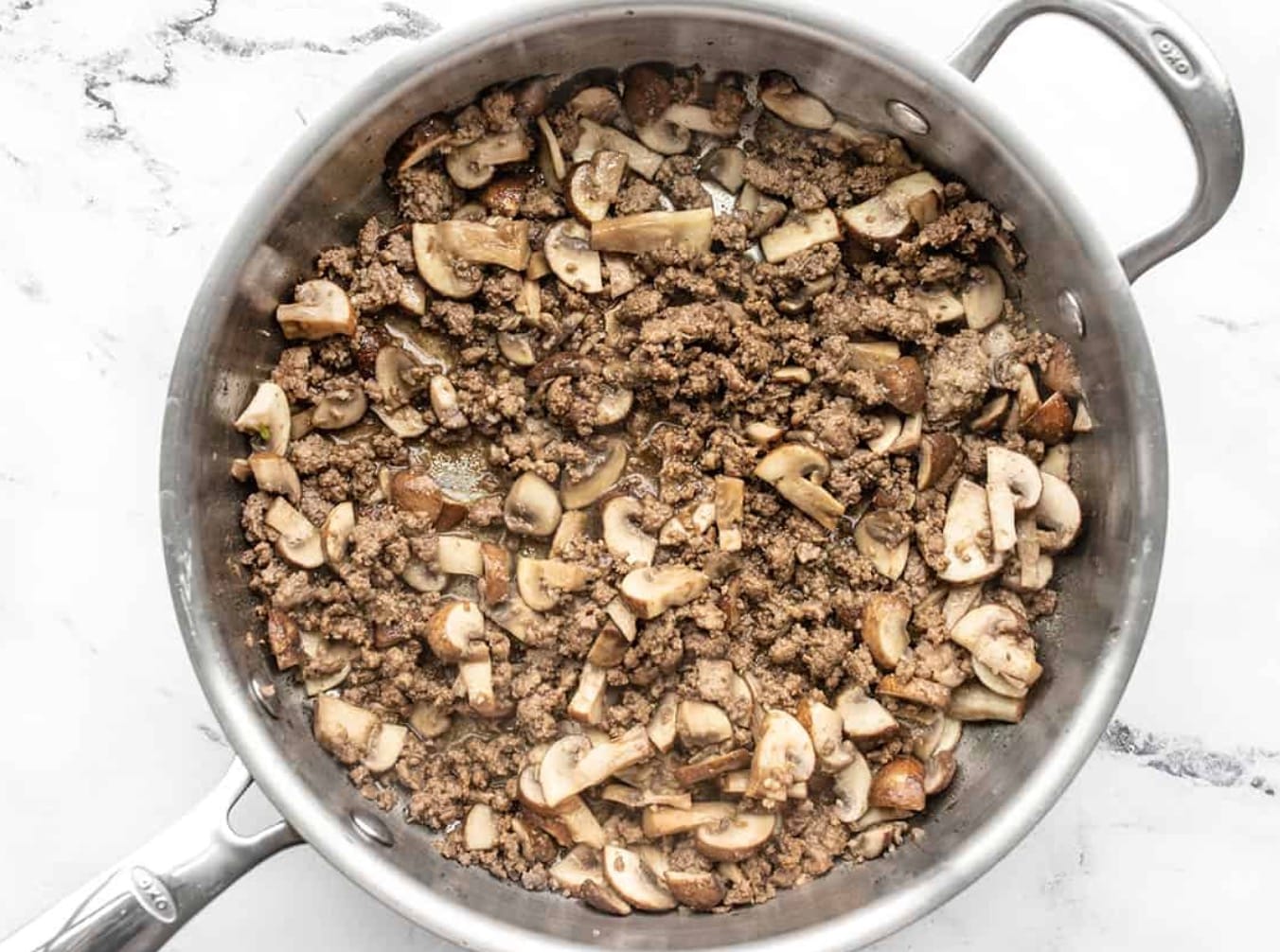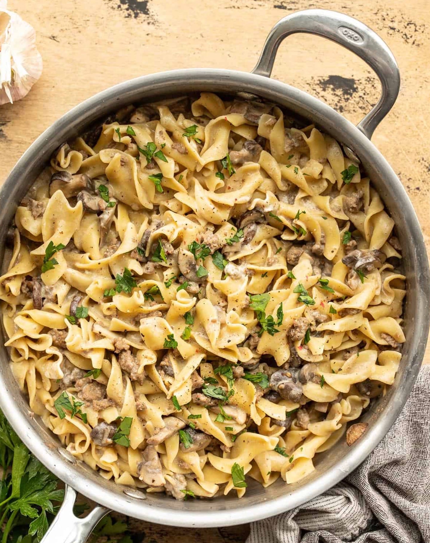For meal prep, cook the beef and mushrooms ahead of time. Store in the fridge, then finish the dish with noodles and sauce when ready to eat.