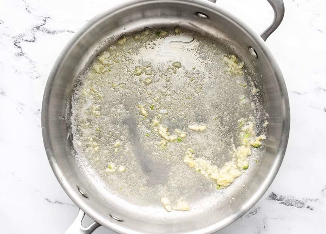 Start by mincing 2 cloves of garlic. Melt 2 tablespoons of butter in a large pot over medium heat. Add the garlic and cook for 1 minute until fragrant.