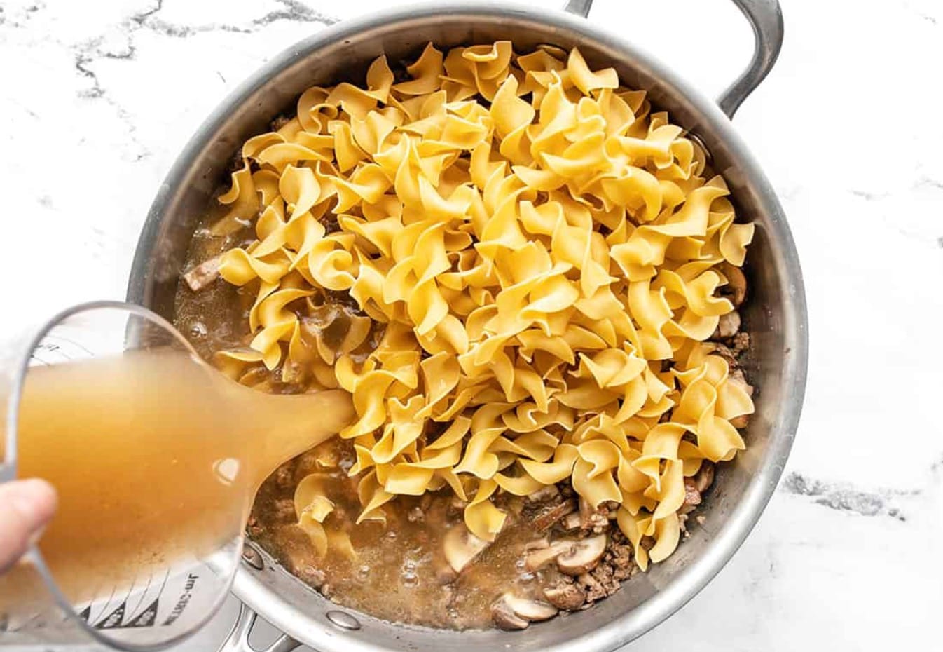 Pour in 2 cups of beef broth, 1 tablespoon Worcestershire sauce, and 1/2 teaspoon Dijon mustard. Stir in 8 ounces of uncooked egg noodles. The liquid won’t cover the noodles completely – that’s okay!