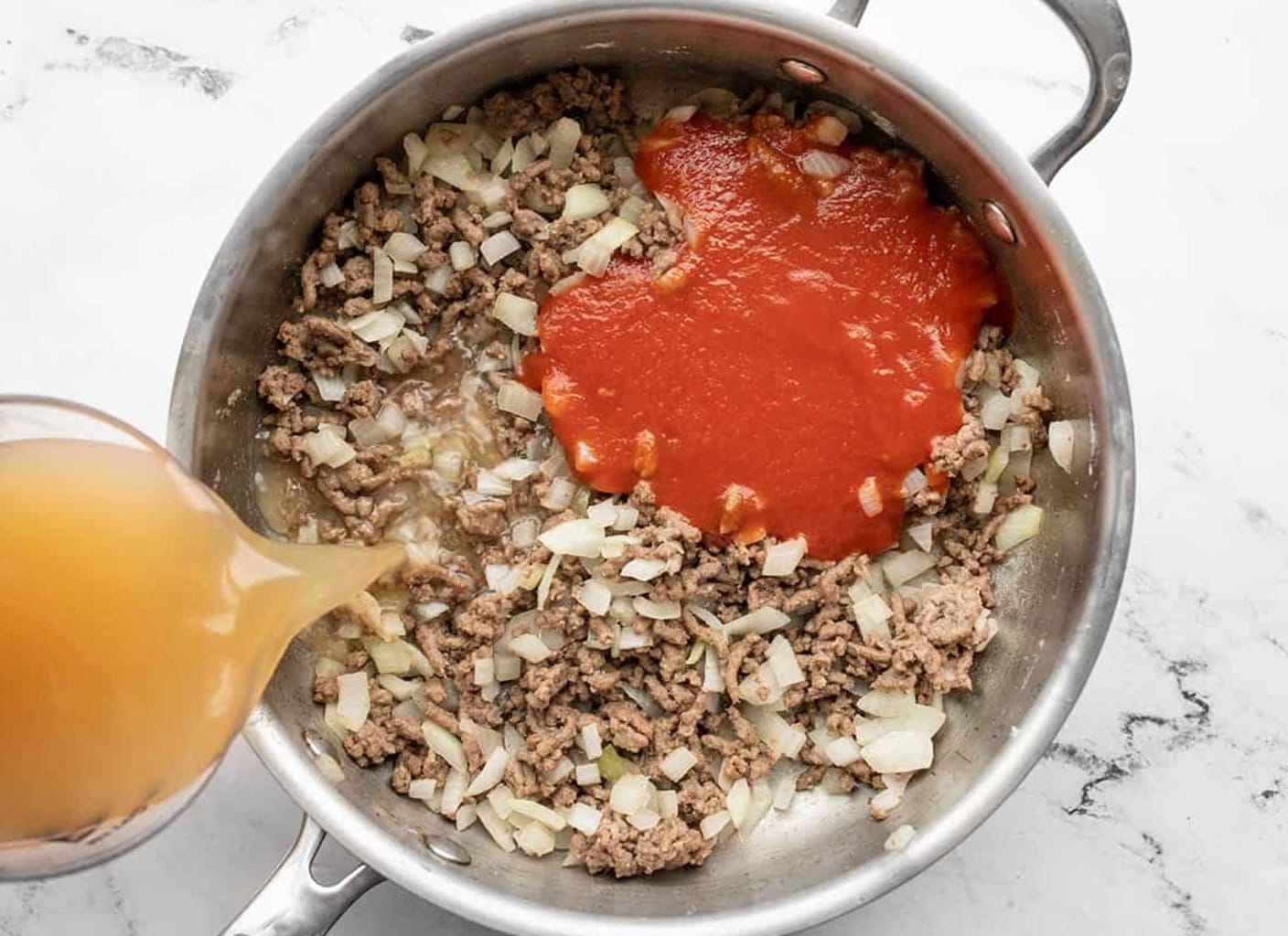 Pour in tomato sauce and beef broth. Stir to mix well.