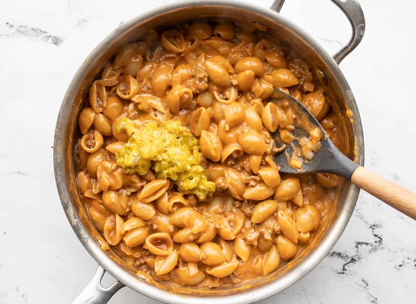 Turn off the heat. Add the cheese and stir until it melts. Mix in the relish. Put green onions on top if you want. Your one-pot cheeseburger pasta is ready to eat!