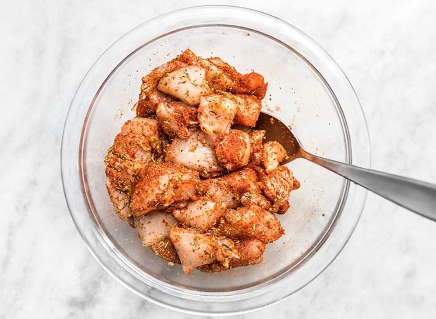 Mix the Cajun spices in a small bowl. Chop the chicken into small cubes and coat with the spice mix.