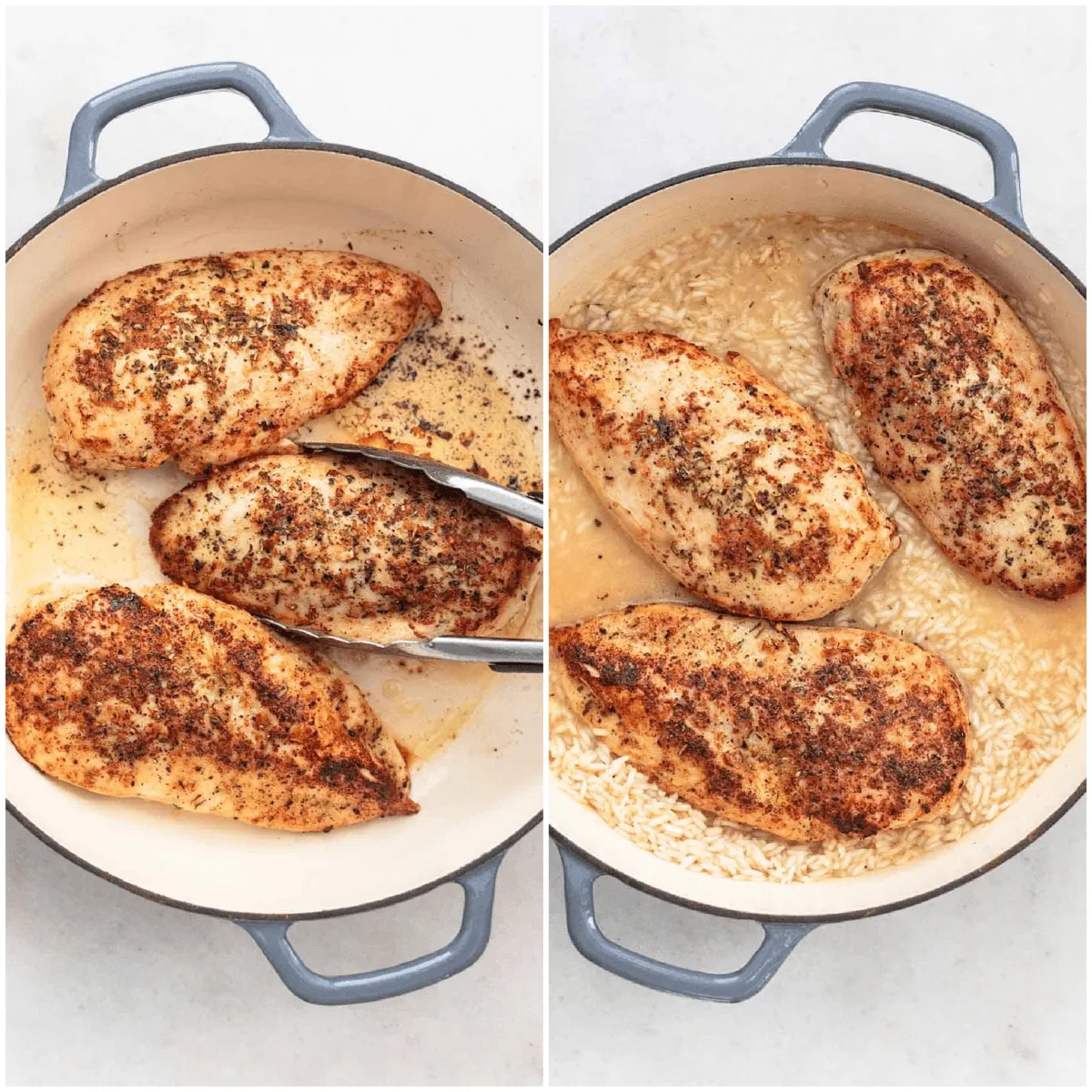 Add rice, chicken broth, lemon juice, and more Italian seasoning to the pan. No need to clean it first! Put the chicken back on top of everything.