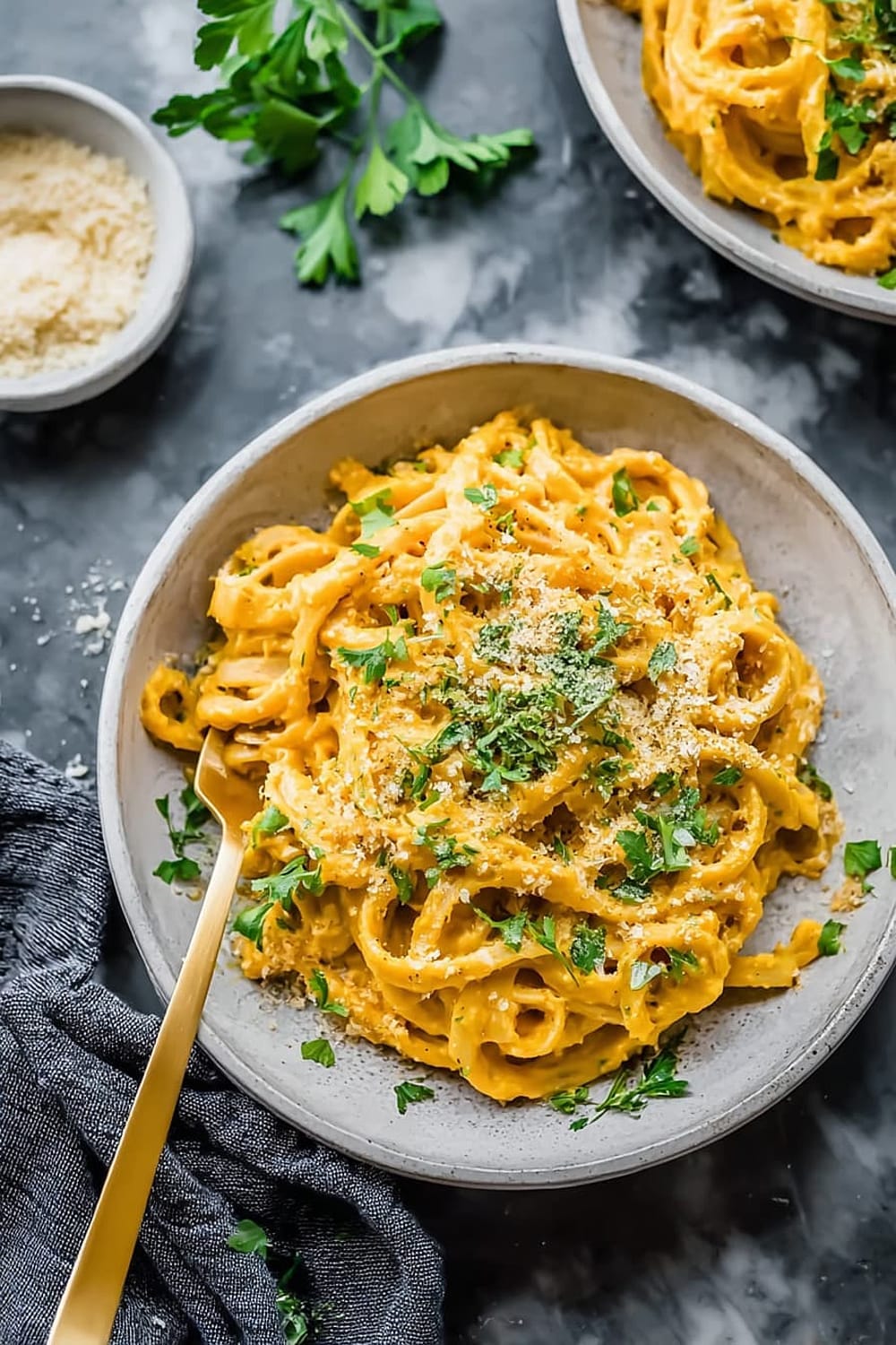 - 8 Remove from heat and taste for seasoning, adding more salt as needed. The flavors should be balanced with the pumpkin’s sweetness, herbs’ earthiness, and a subtle umami depth from the miso. Garnish generously with fresh parsley and vegan parmesan cheese before serving immediately.