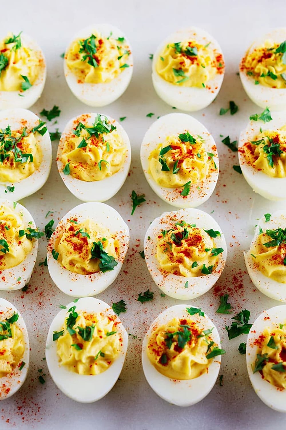 Picture this: silky smooth, golden yolk filling that’s been perfectly seasoned and piped back into pristine egg white halves, then garnished with vibrant paprika and fresh parsley that makes them absolutely irresistible.