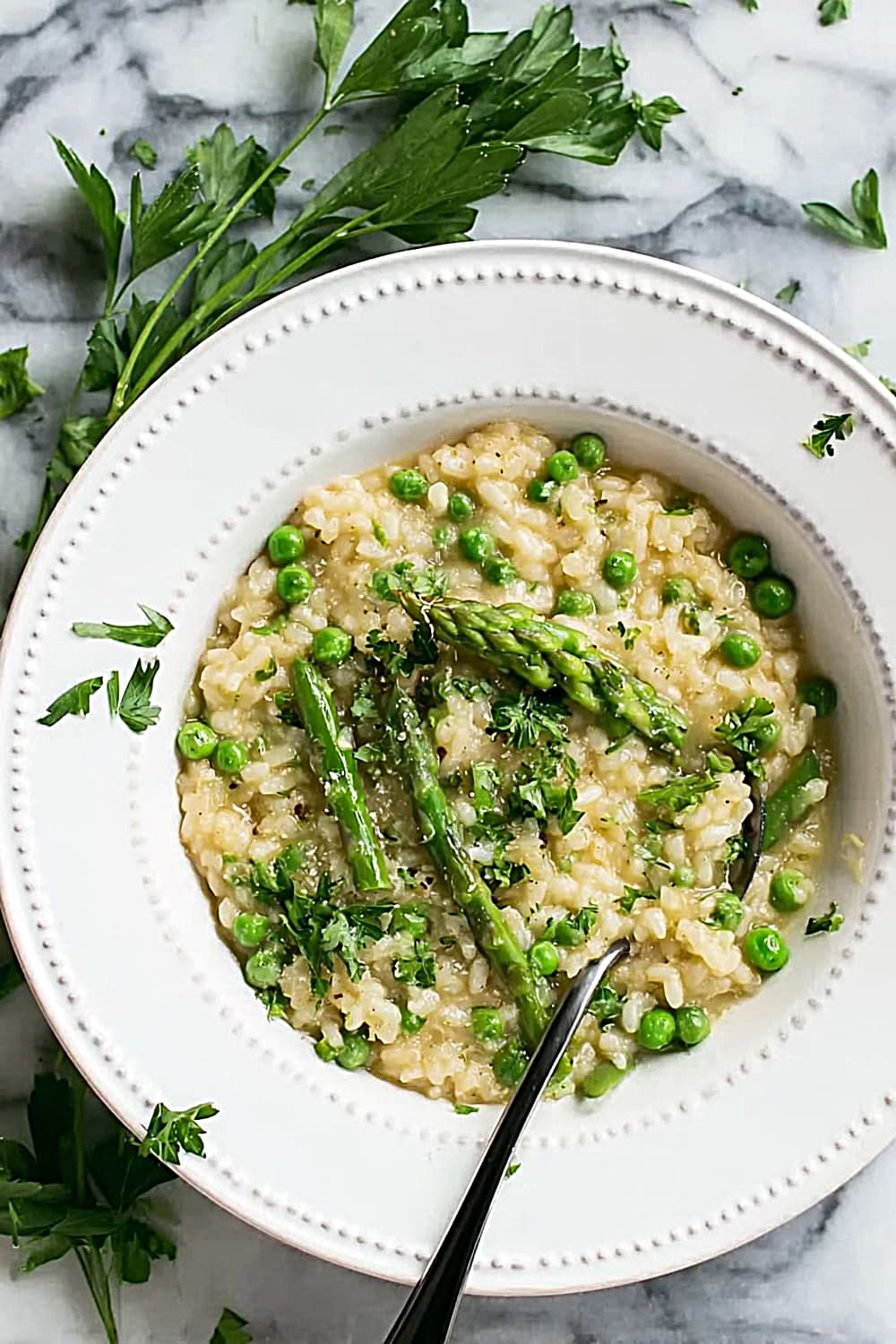 The combination of sweet English peas, tender roasted asparagus, and nutty brown arborio rice creates a symphony of flavors and textures that’ll make your taste buds sing with joy.