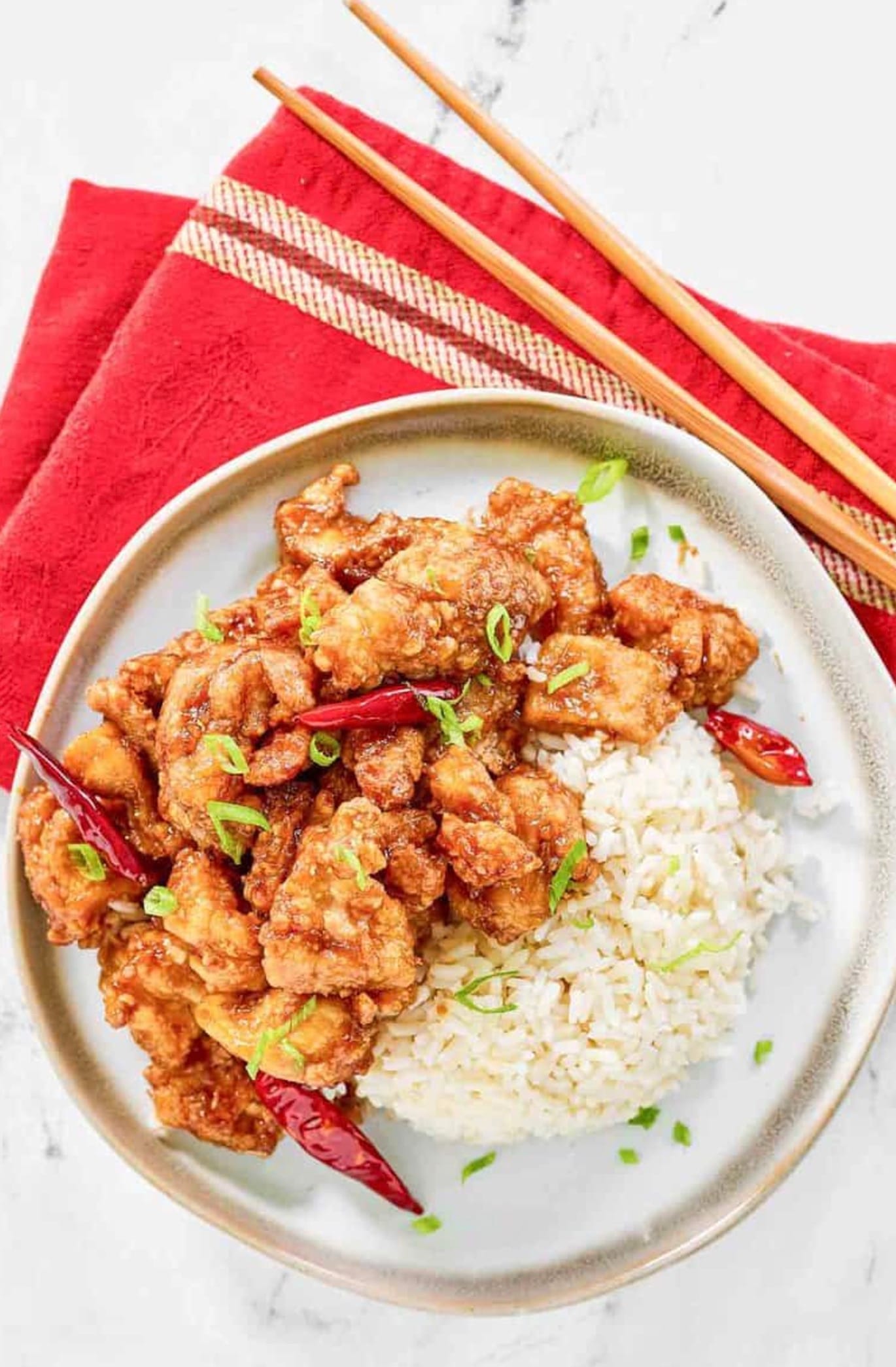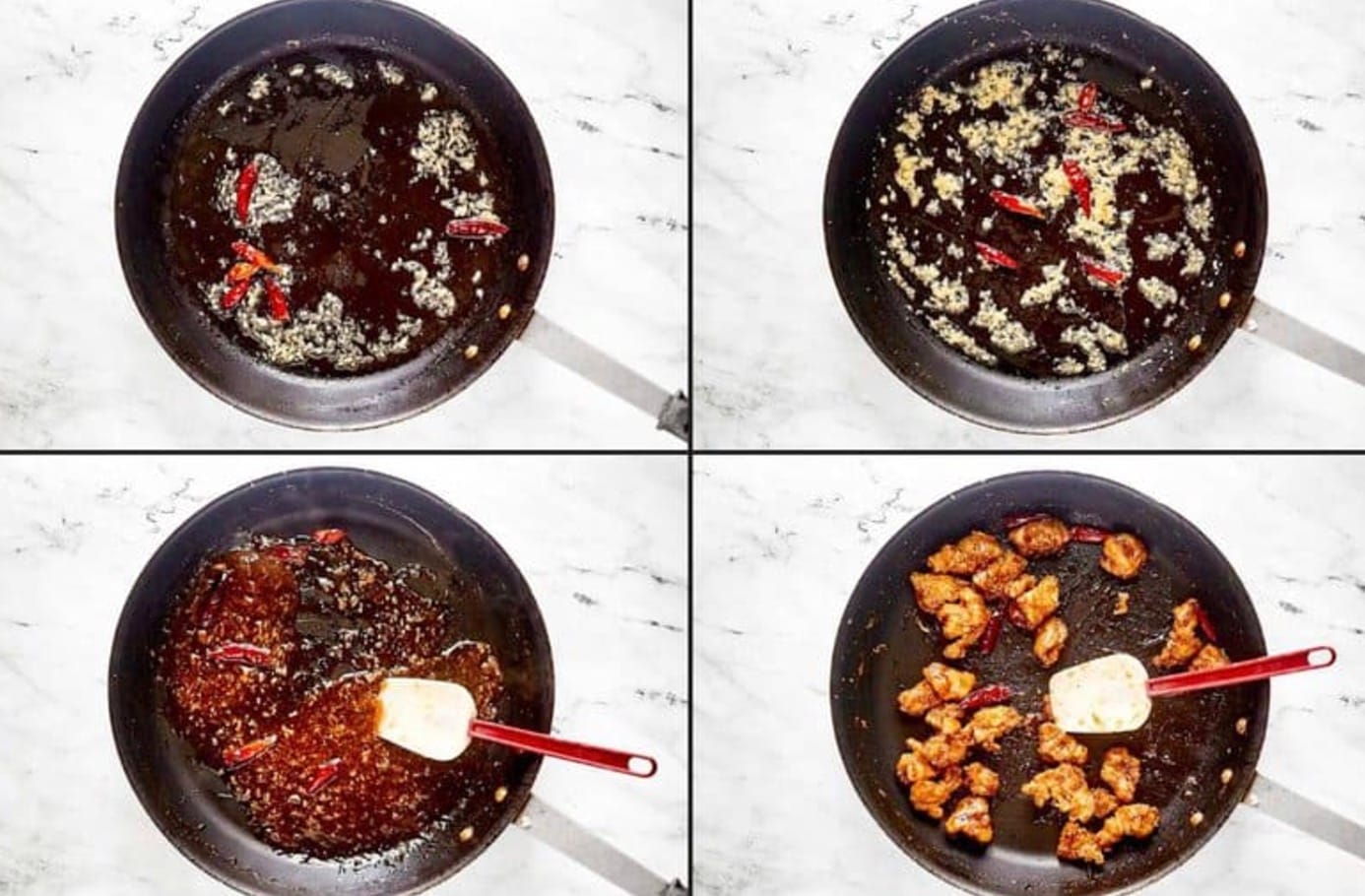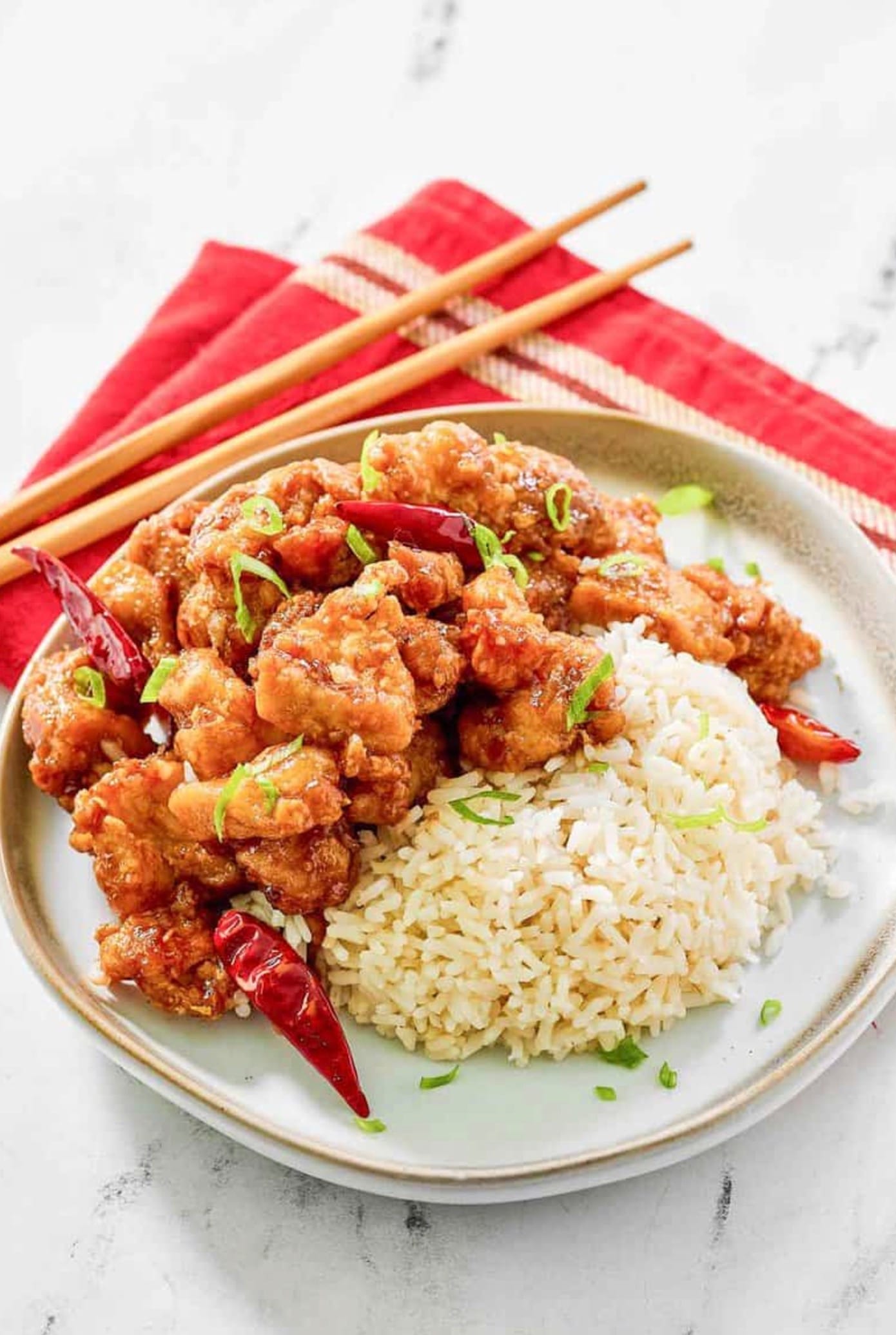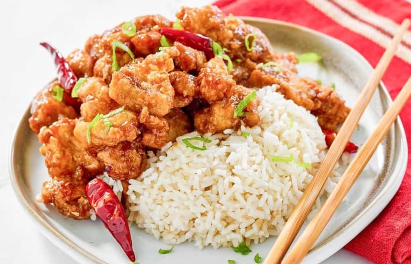 To make the chicken, you’ll coat pieces in a seasoned egg mixture and cornstarch before frying until golden brown. Then you’ll stir-fry dried chilis, garlic, and ginger before adding the orange sauce. The result is crispy chicken bites coated in a spicy-sweet glaze that rivals the restaurant version.