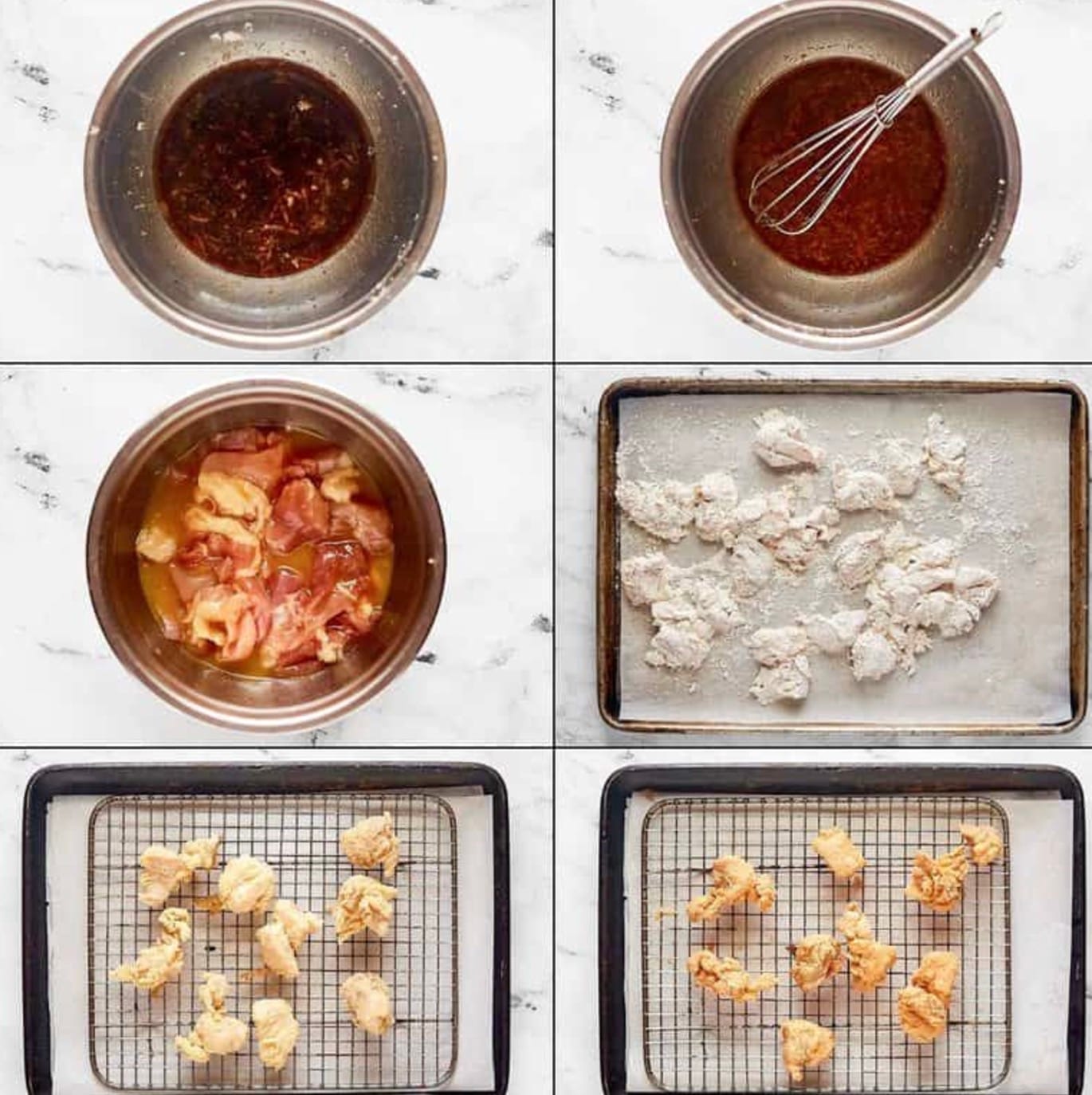 - Then dip the chicken in the flour mixture and coat all sides, pressing down lightly to ensure the meat is coated. Shake off the excess and place it on the wire rack. Repeat with the remaining chicken pieces.