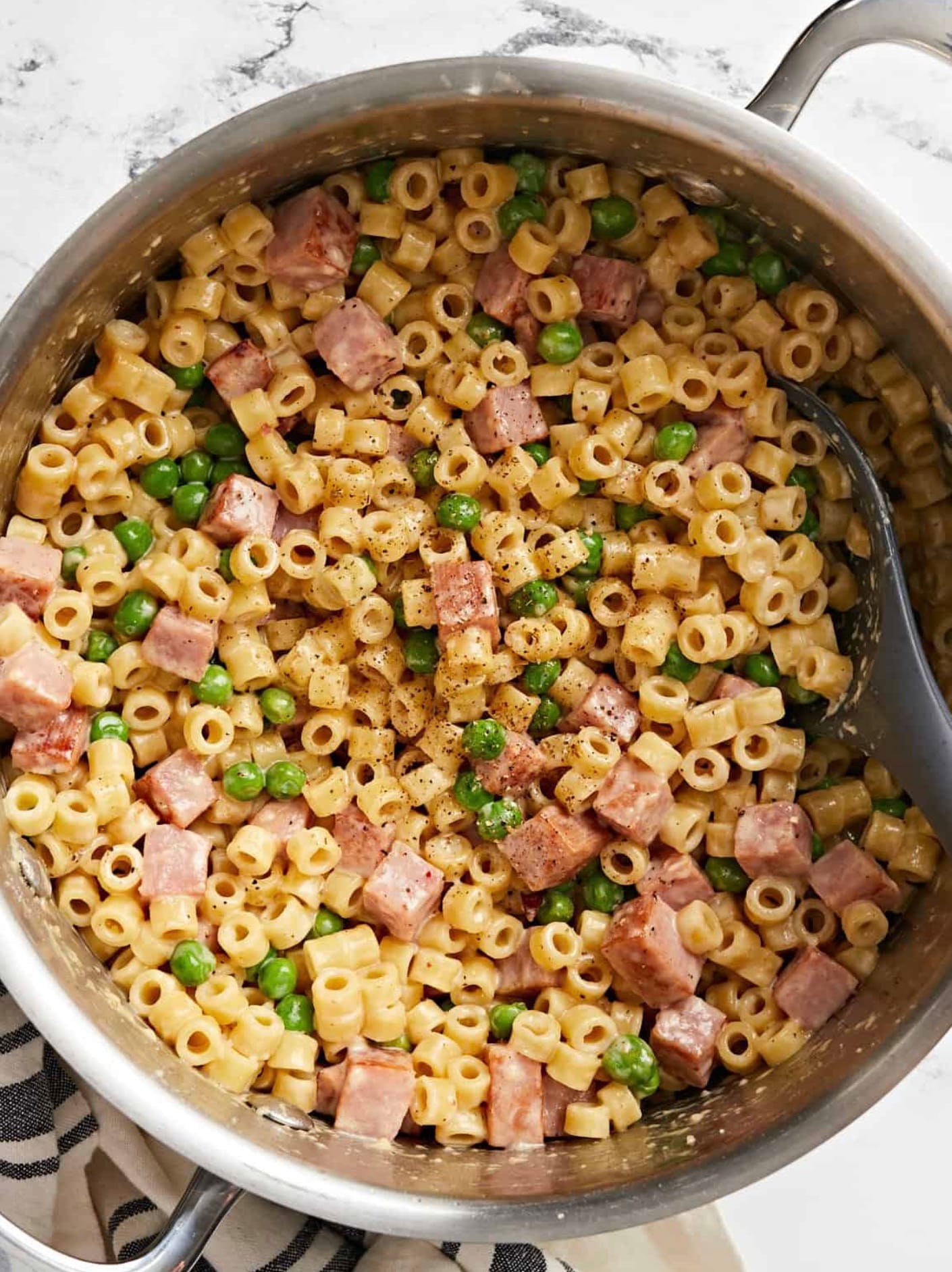 For the ham, look for a ham steak in the meat section. You’ll dice it up into small pieces before cooking. The frozen peas add a nice pop of color and sweetness.