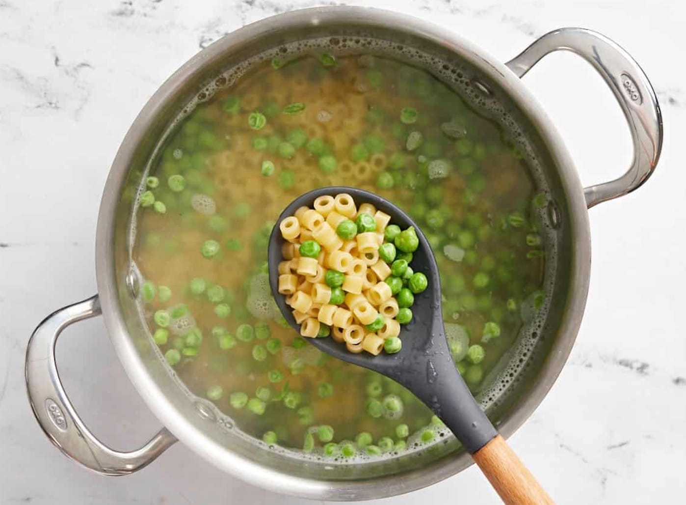 Toss in 1 cup of frozen peas during the last minute of cooking. Drain everything in a colander when done.