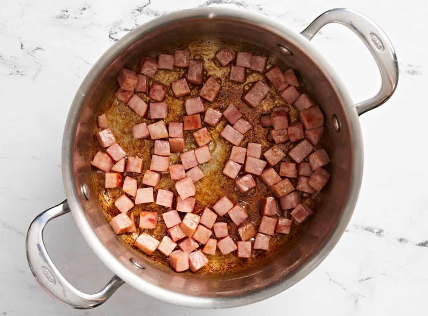 While the pasta cooks, cut up 8 oz of ham steak into small cubes. Put the empty pot back on the stove and add the ham with 1 tbsp of butter. Cook on medium heat, stirring often, until the ham gets a bit brown and crispy.