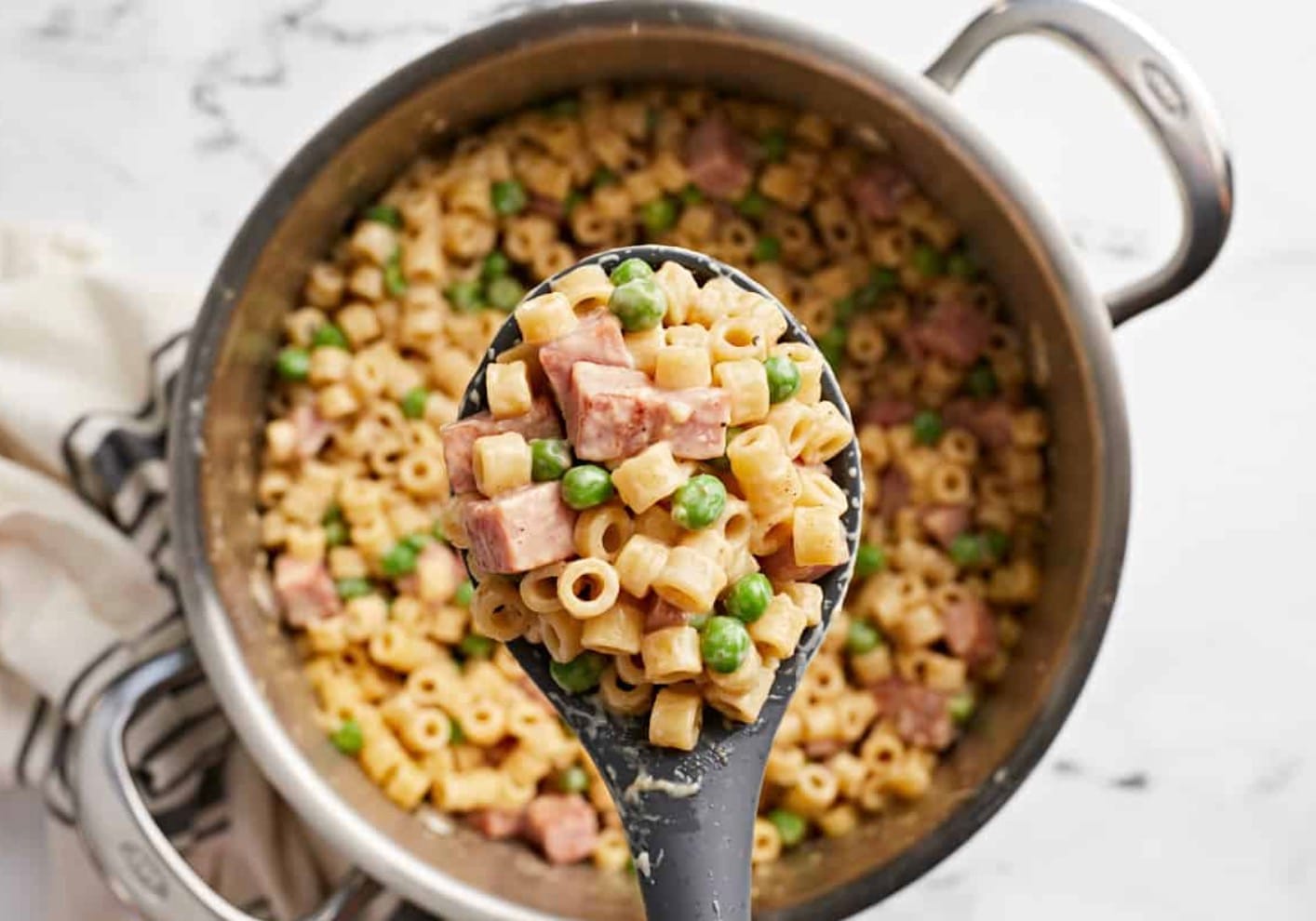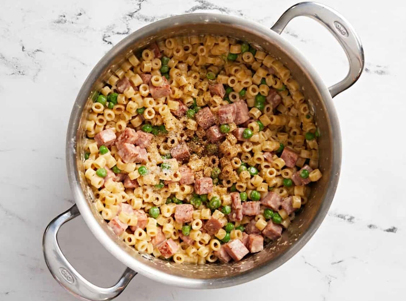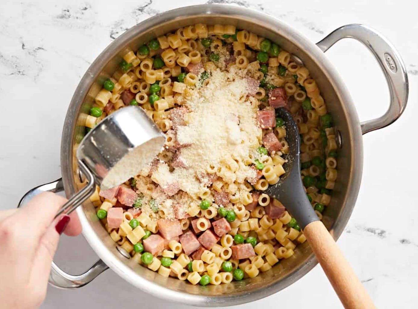 The recipe uses simple ingredients you might already have in your kitchen. With just pasta, frozen peas, ham, butter, cream, and Parmesan, you can create a filling meal the whole family will enjoy. The cream and cheese make a rich sauce that coats every bite.